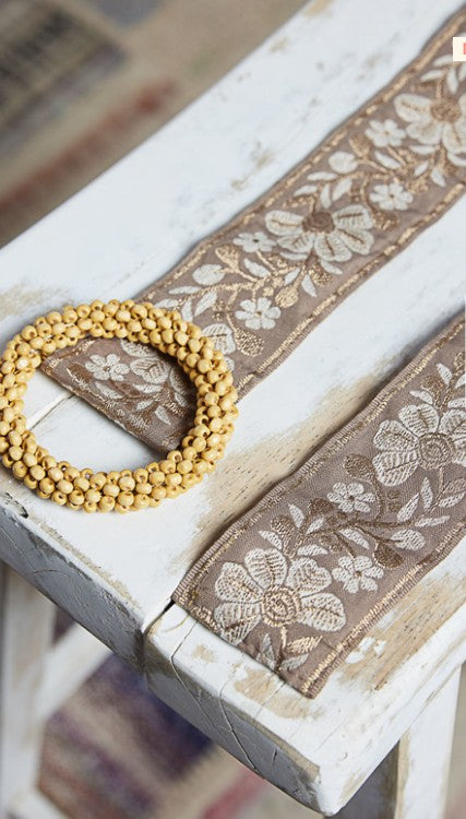 This beautifully embroidered belt features soft taupe and ivory floral detailing with a natural wooden bead buckle for a relaxed, boho-chic vibe. Perfect for cinching dresses, layering over sweaters, or styling with denim, it adds texture and effortless charm to any outfit.