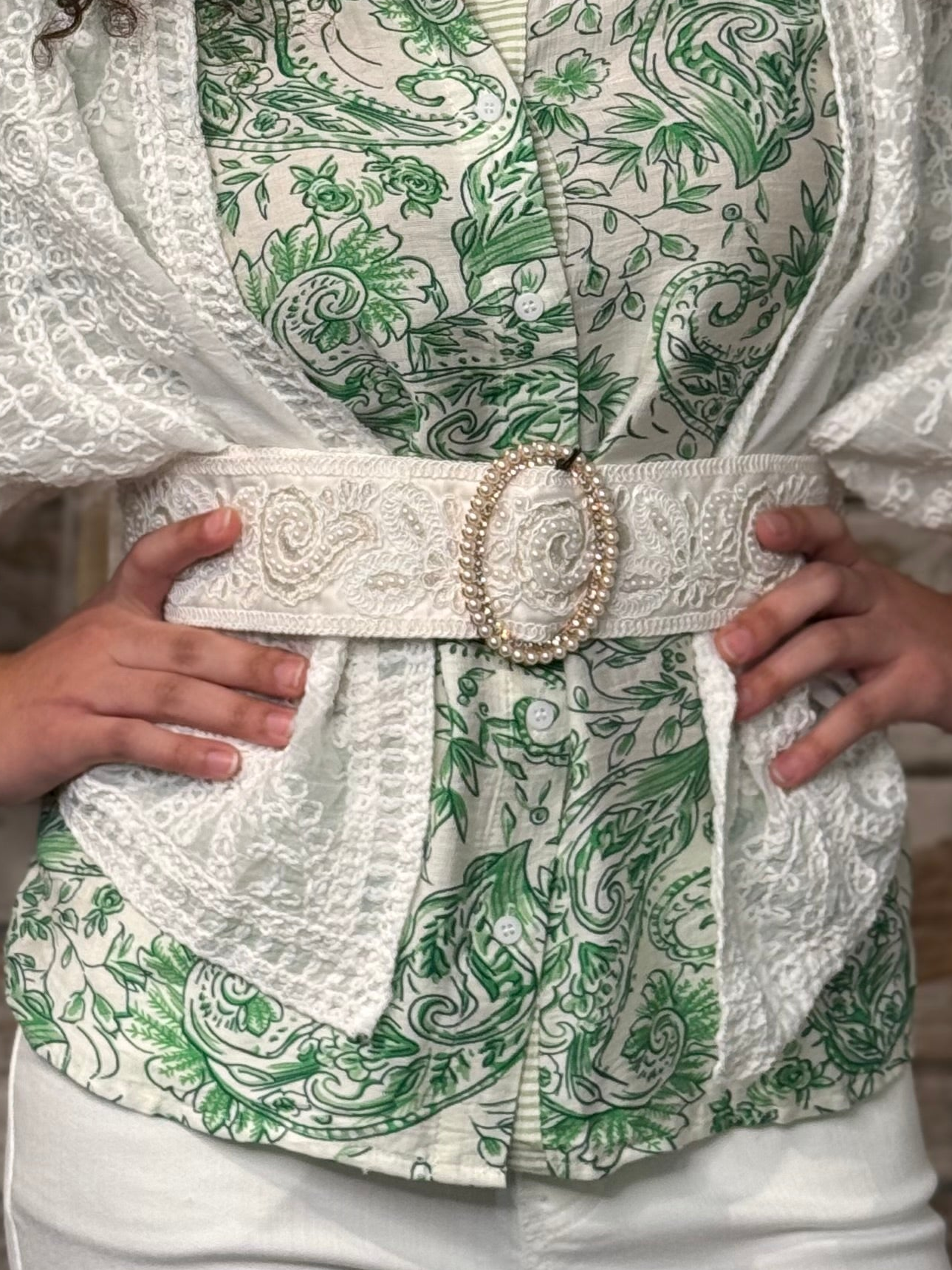 Elevate any outfit with this elegant ivory embroidered belt featuring intricate floral stitching and a vintage-inspired oval buckle. The soft neutral tone makes it easy to pair with dresses, denim, or layered looks, while the detailed design adds a refined boutique touch.