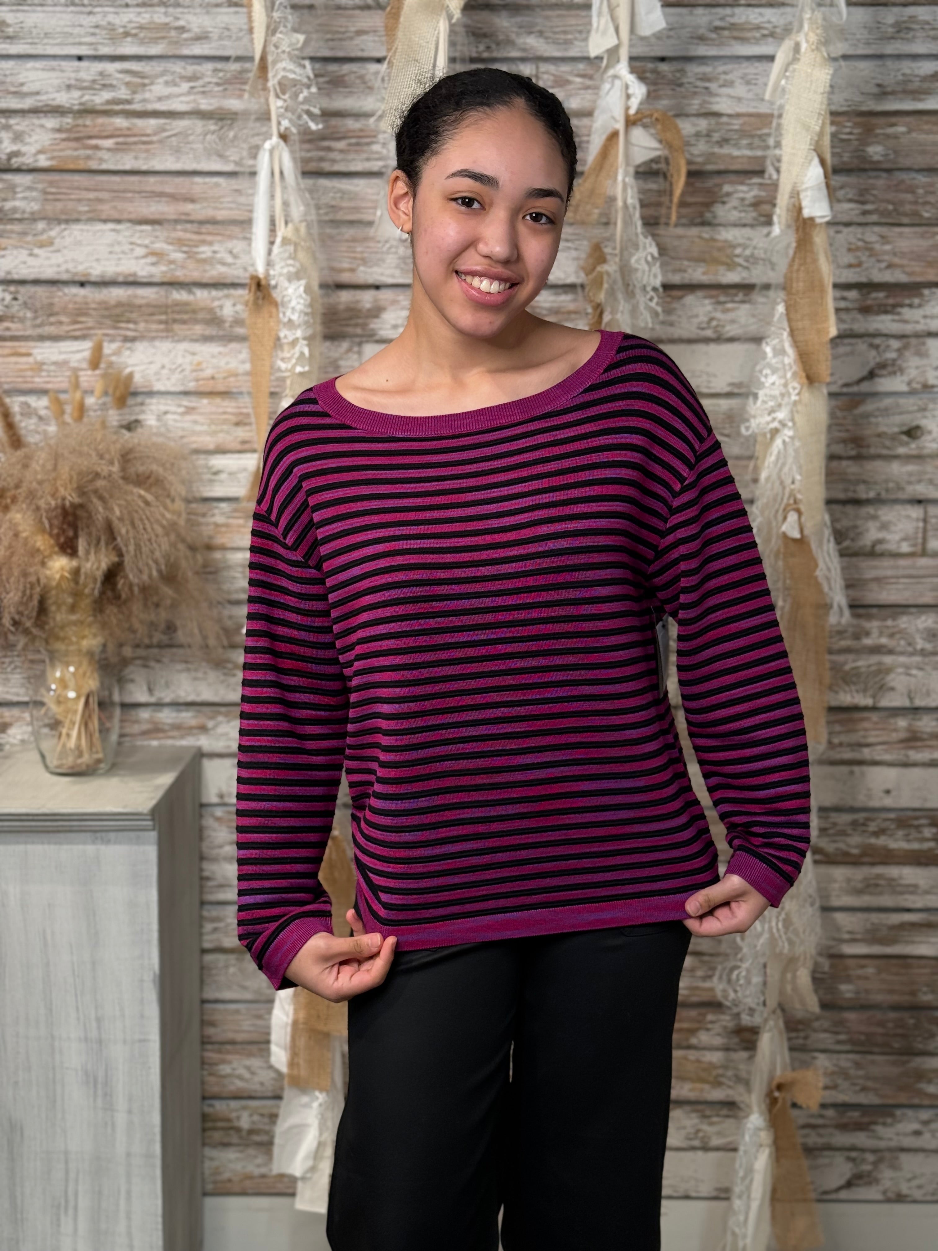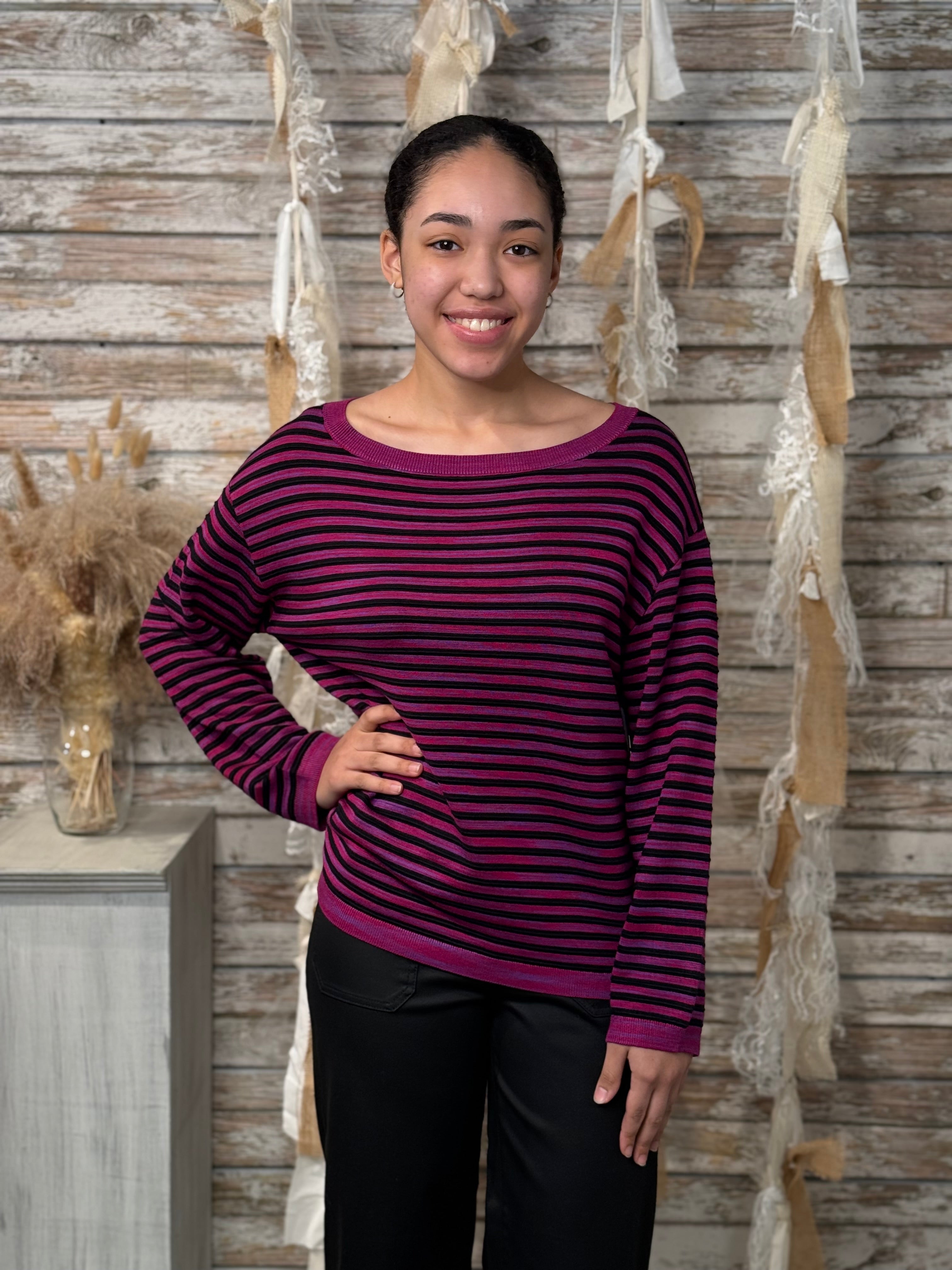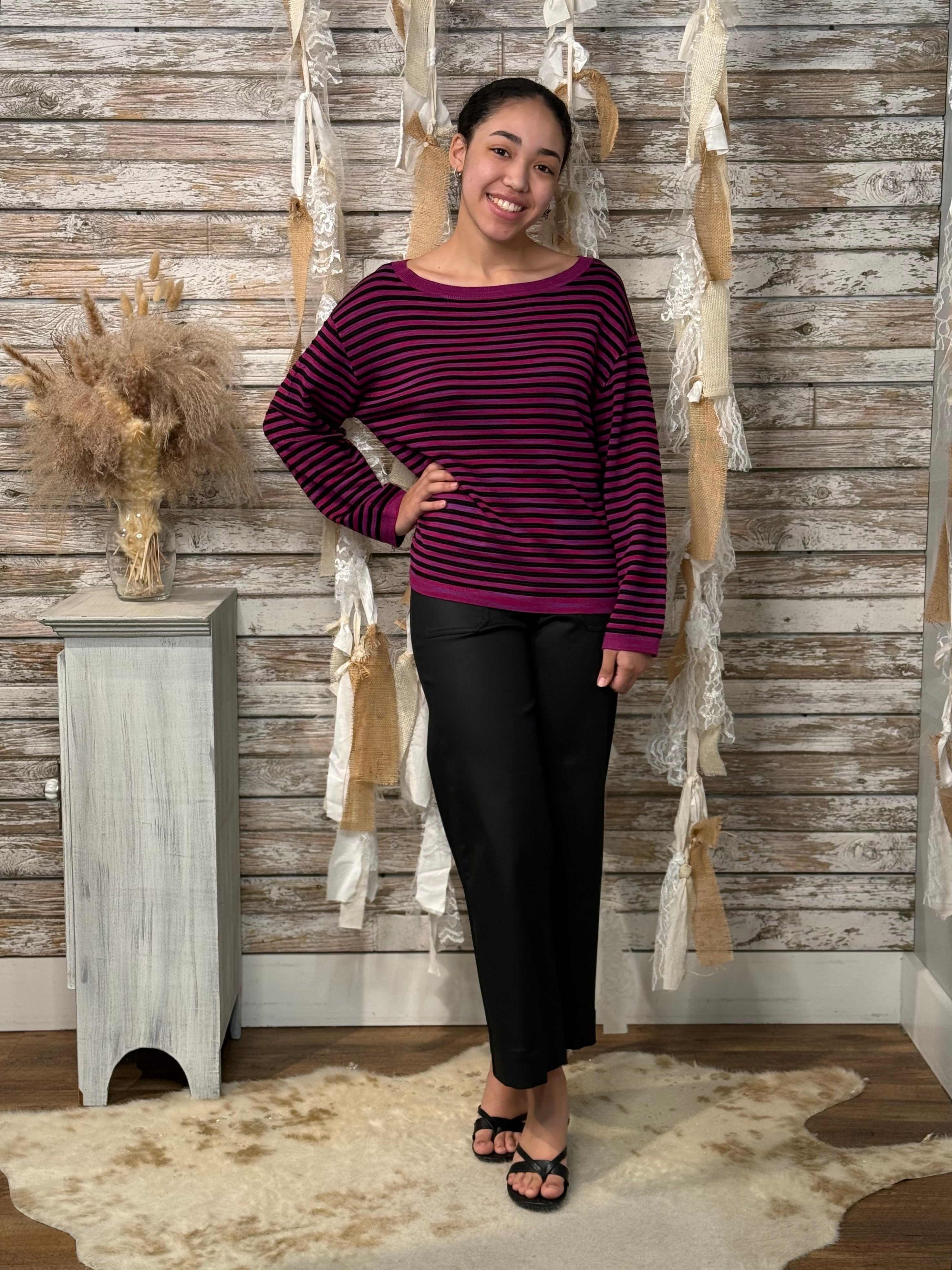 Women’s Striped Crew Neck Sweater – Pink and Black Knit Pullover