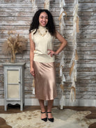 Elevate your wardrobe with this effortlessly elegant champagne satin midi skirt. Designed with a smooth, silky finish and a flattering high-waist silhouette, this skirt drapes beautifully for a soft, feminine look. The midi length makes it perfect for dressing up with heels or keeping it casual with sweaters and boots. A timeless piece that transitions seamlessly from day to night.