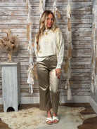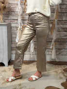 Shine from every angle in the Golden Hour Flare Pant. Crafted from metallic waxed twill, this high-style silhouette delivers a subtle shimmer that catches the light just right. The cropped flare leg and front welt pockets add a tailored edge, balancing glam with everyday wearability. Pair with a sleek turtleneck and boots for modern sophistication — or go bold with a silky blouse for an evening out. Effortlessly radiant, endlessly chic.