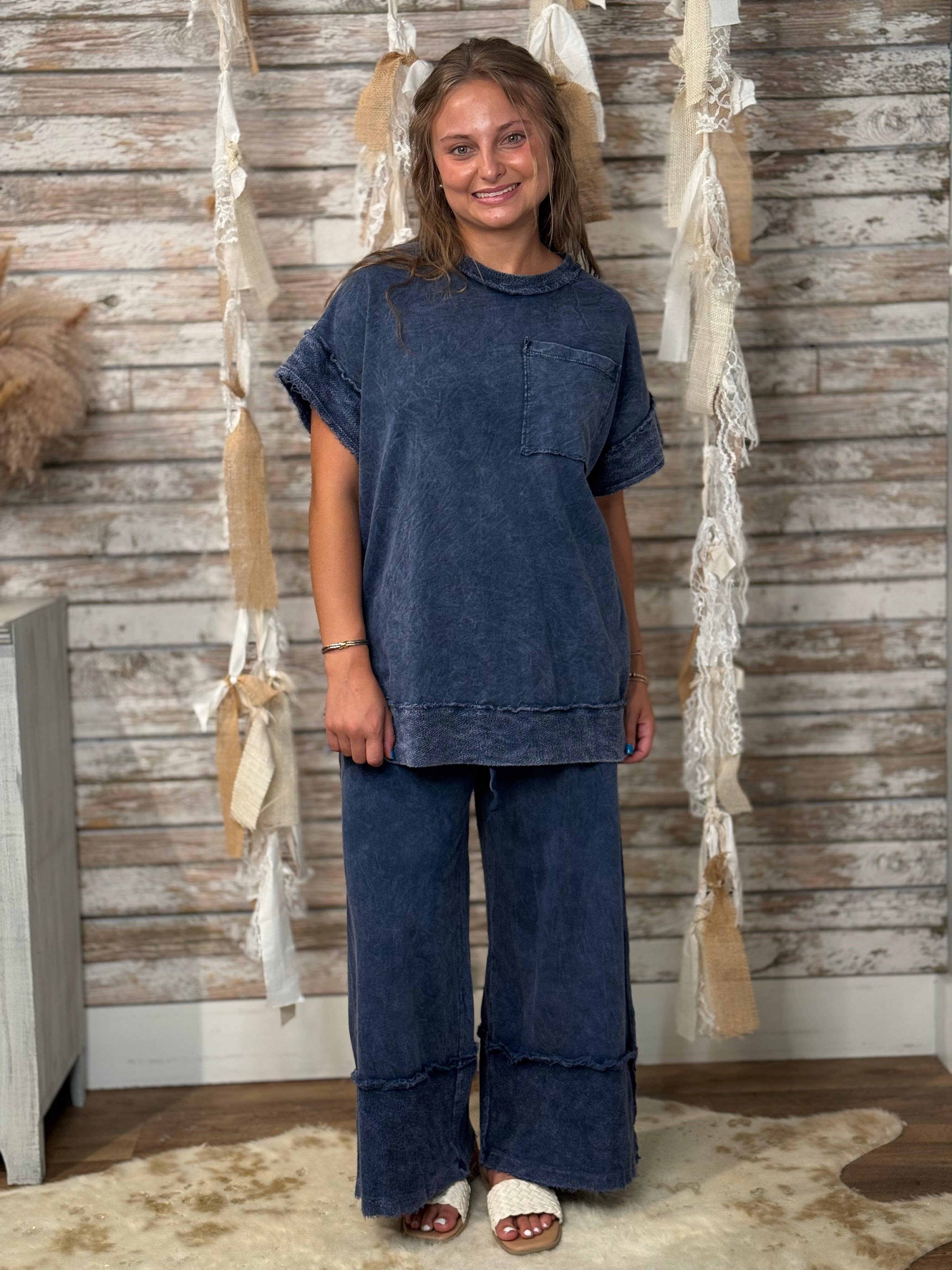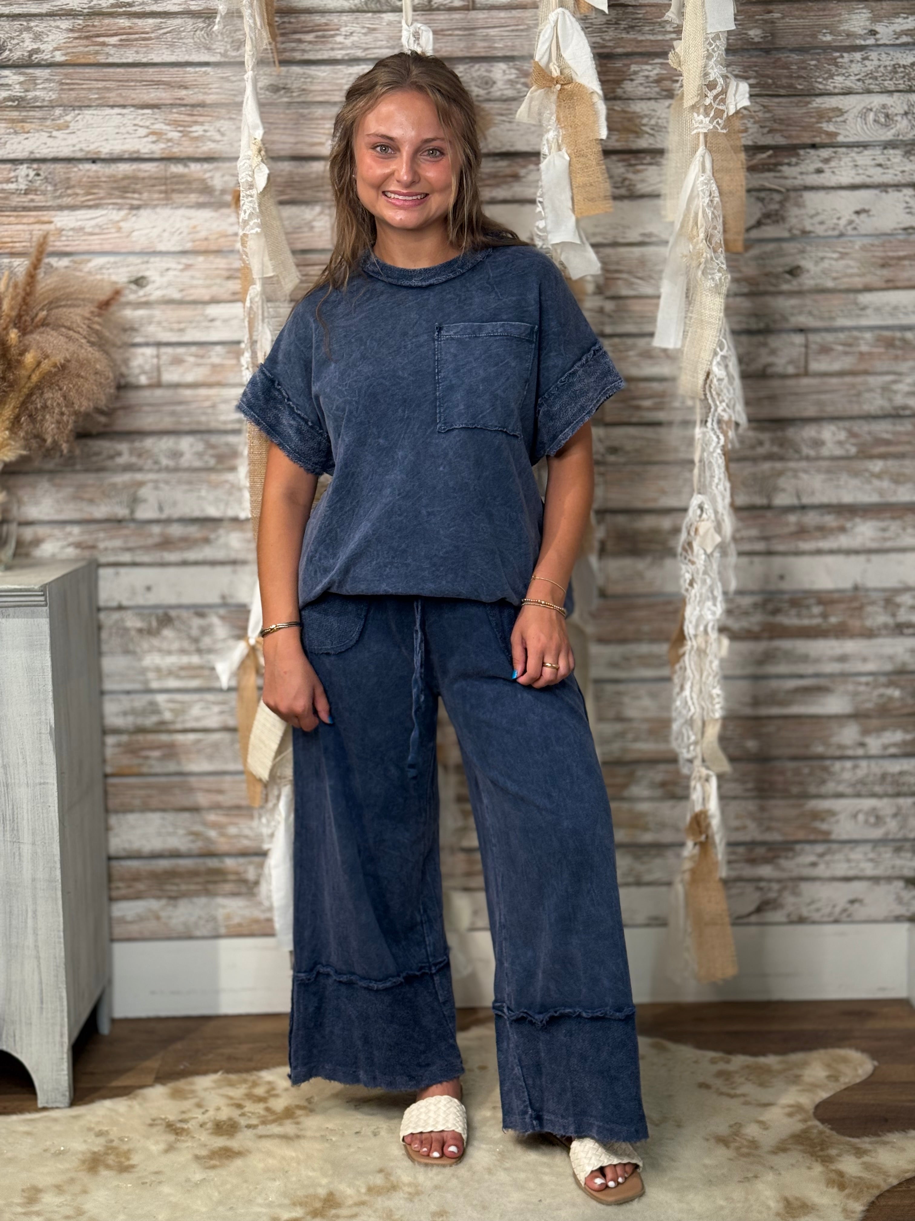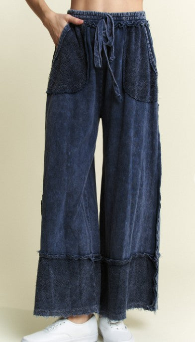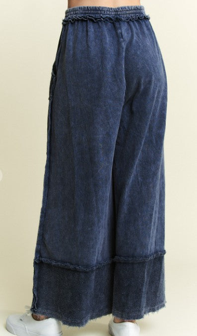 Relaxed with a touch of rugged, the Indigo Edge Wide Leg Pants bring effortless cool to your everyday look. Featuring a mineral wash finish, raw hem frayed details, oversized front pockets, and a comfy drawstring waist, these pants are made for laid-back days with style. Pair with sneakers and a tank or cropped tee for an easygoing, artsy vibe that stands out.