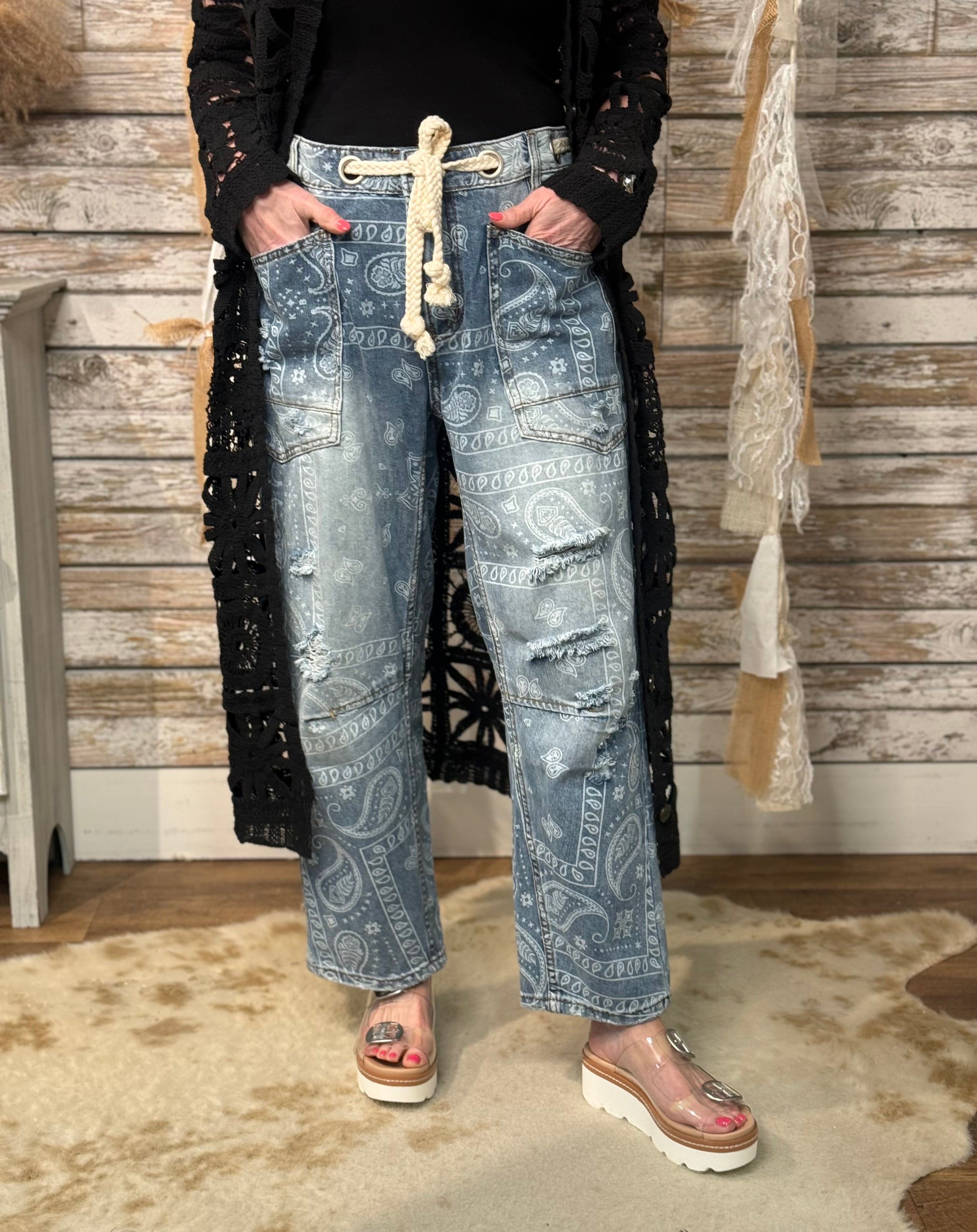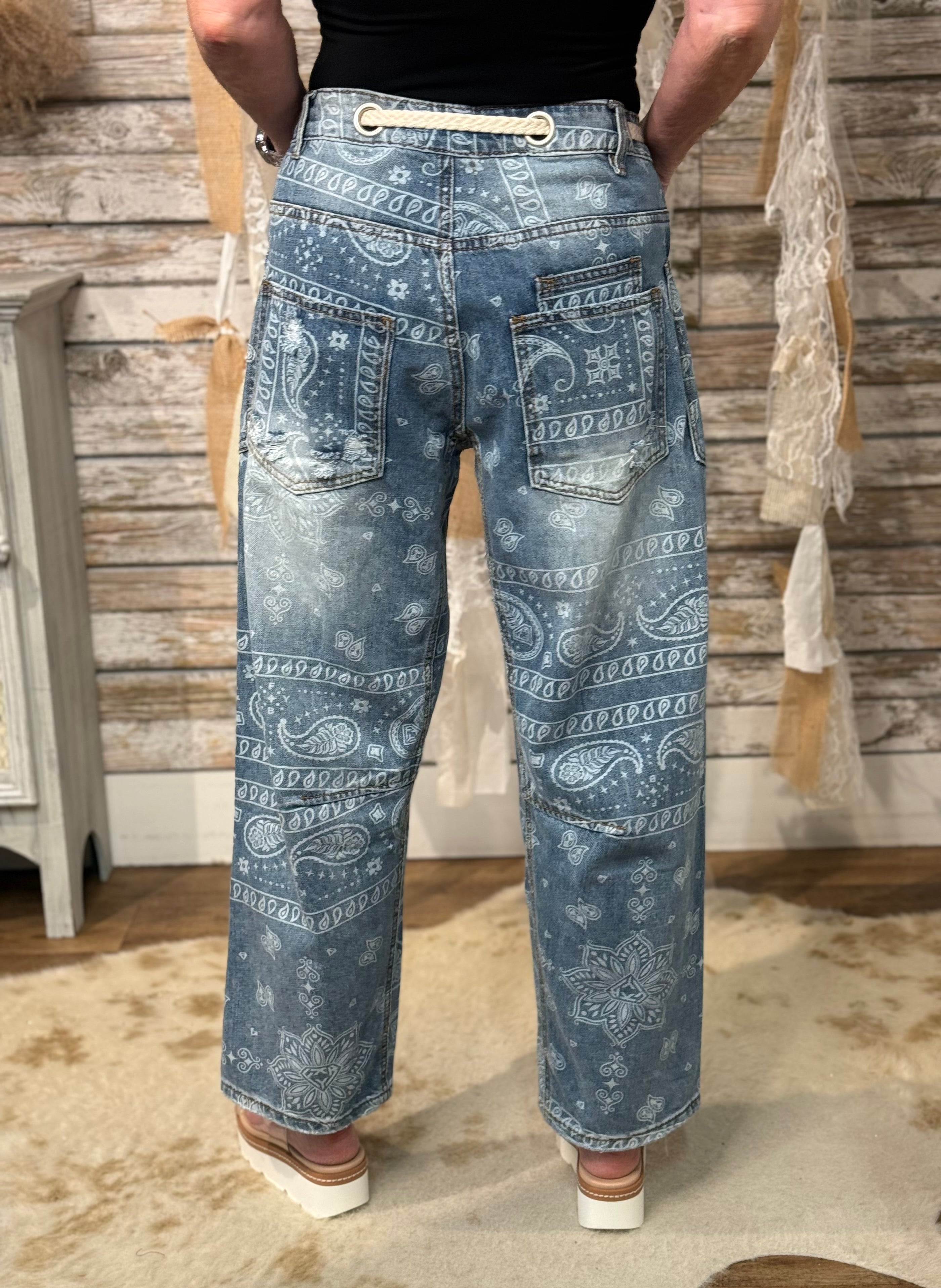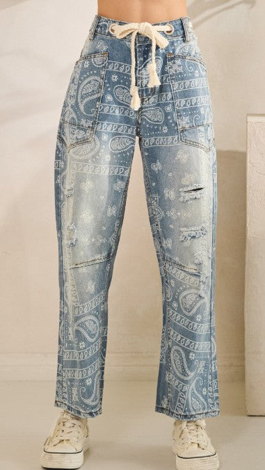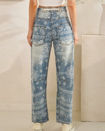 Bring vintage charm and modern comfort together with these statement-making paisley patch denim pants. Designed with an allover washed paisley print and subtle distressed details, these wide-leg jeans offer a relaxed, on-trend fit that’s perfect for everyday wear. The adjustable rope drawstring waist adds a casual, laid-back vibe while ensuring a comfortable, flexible fit. Pair them with graphic tees, cozy knits, or flowy blouses for effortless boho-inspired style.