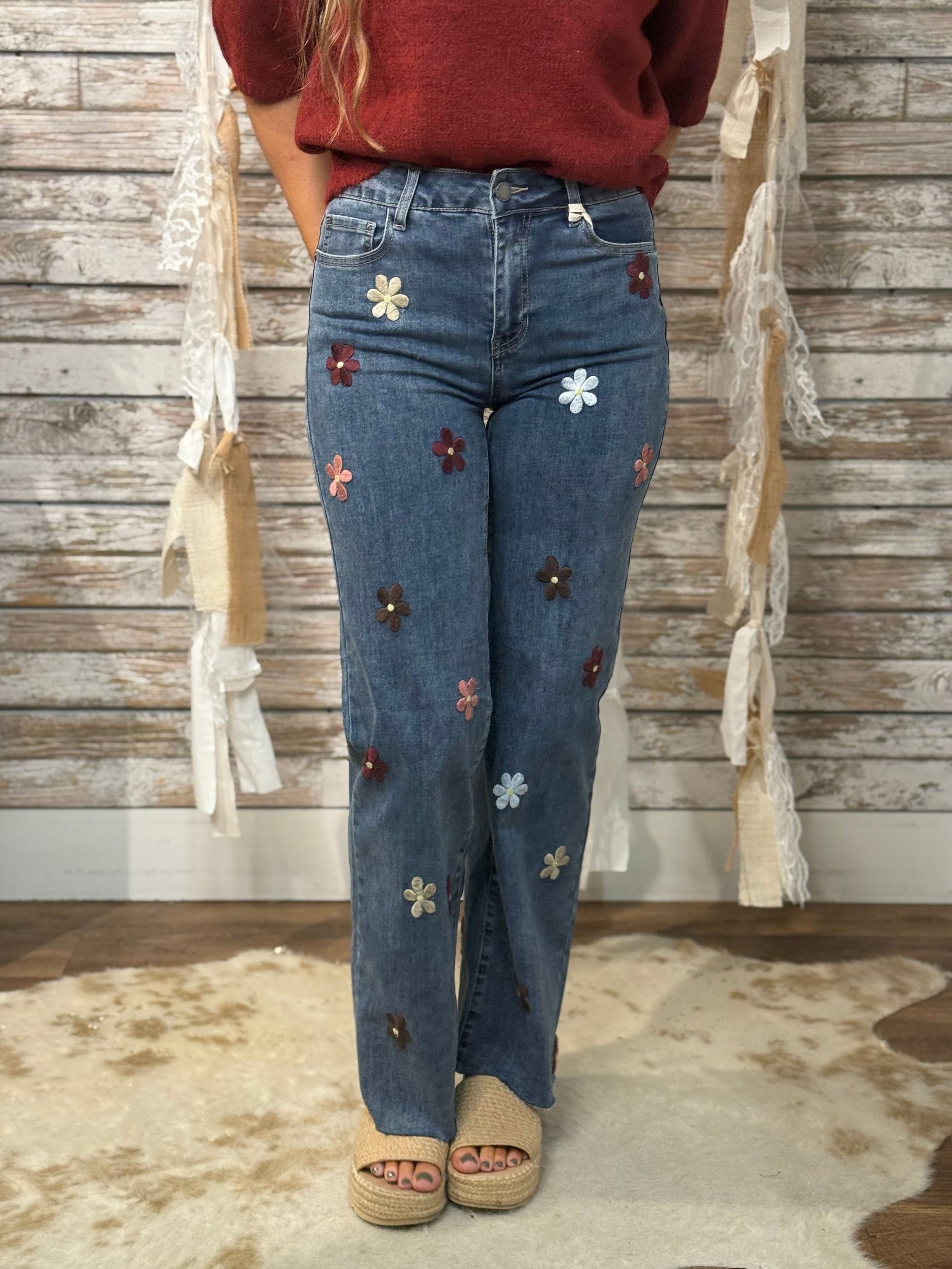 Bloom with every step in the Meadow Stroll Patch Jeans, where classic wide-leg stretch denim meets whimsical, all-over floral patches. Bursting with charm and comfort, these playful statement pants are your go-to for adding a pop of personality to casual days and weekend adventures.