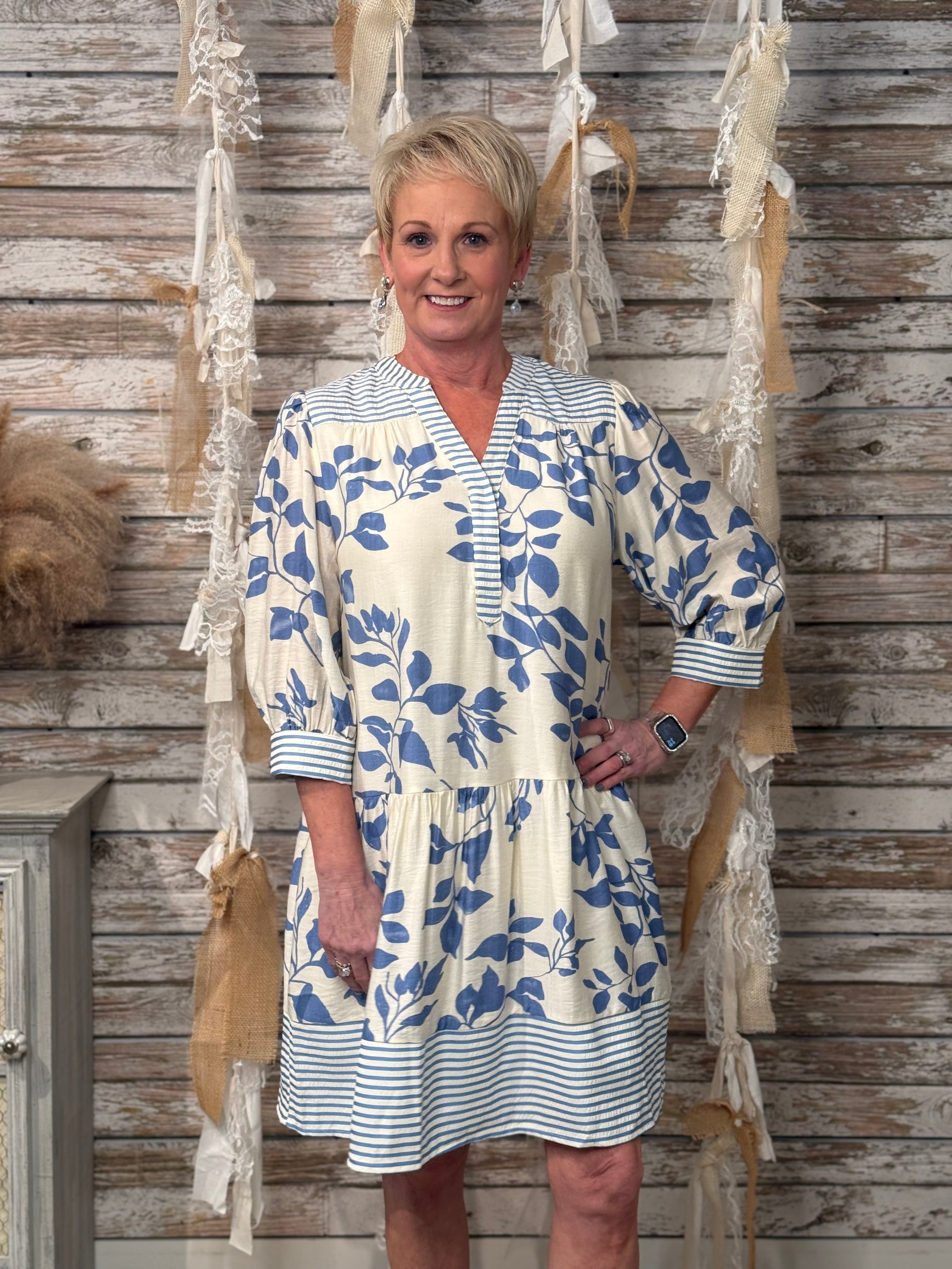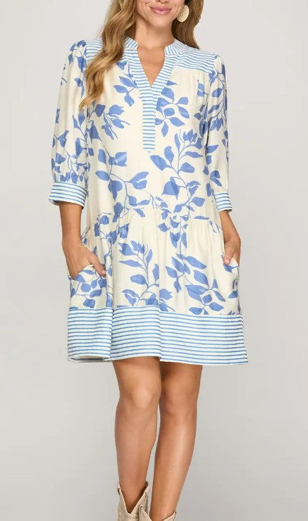 Fresh, feminine, and effortlessly flattering, this blue floral pocket dress is perfect for everyday wear. Designed with a soft V-notch neckline, three-quarter sleeves, and a relaxed fit, this dress features a beautiful floral print with striped trim accents at the neckline, cuffs, and hem. Side pockets add comfort and convenience, while the lightweight fabric makes it ideal for warm days, brunch dates, or casual outings.
