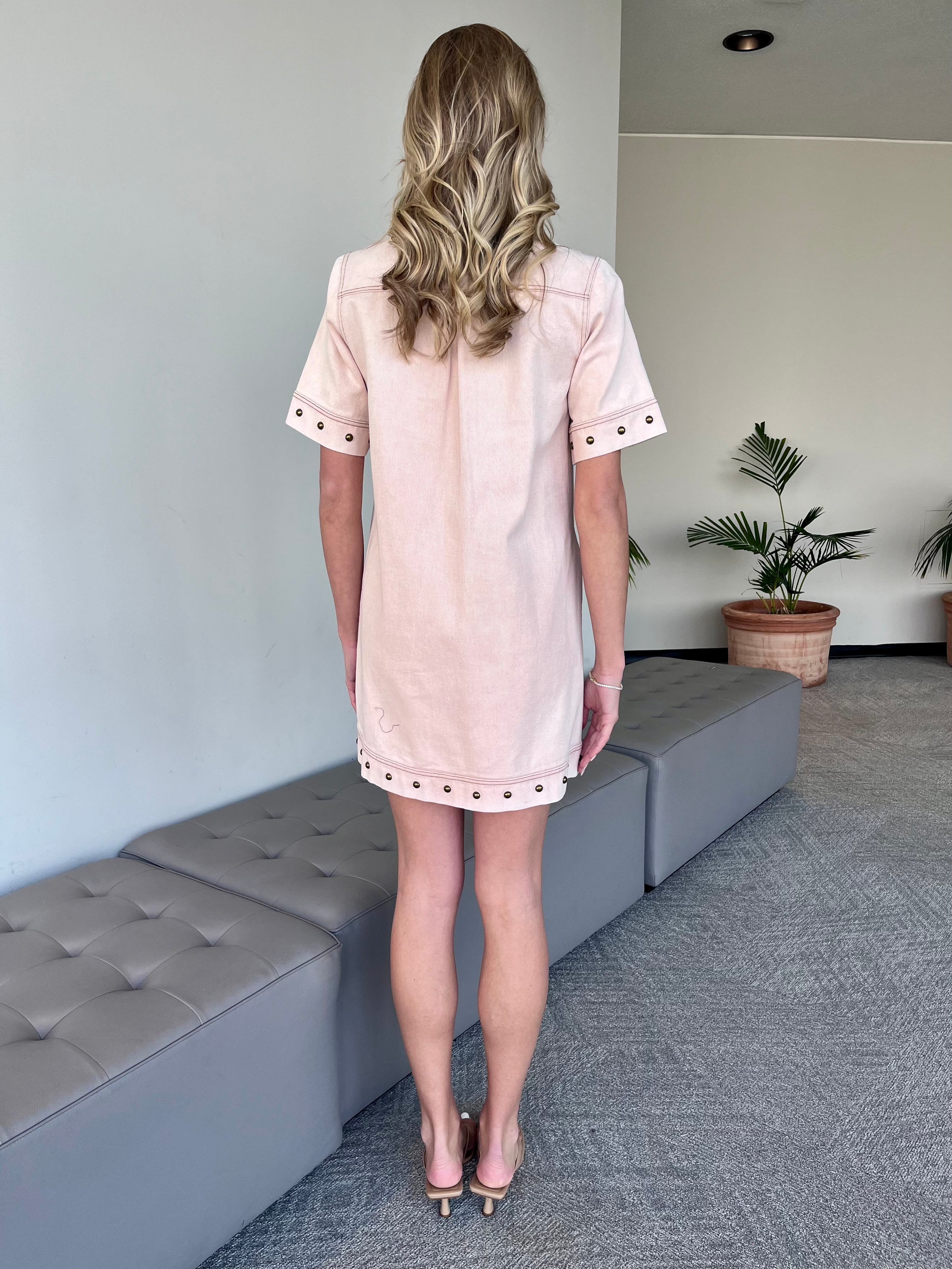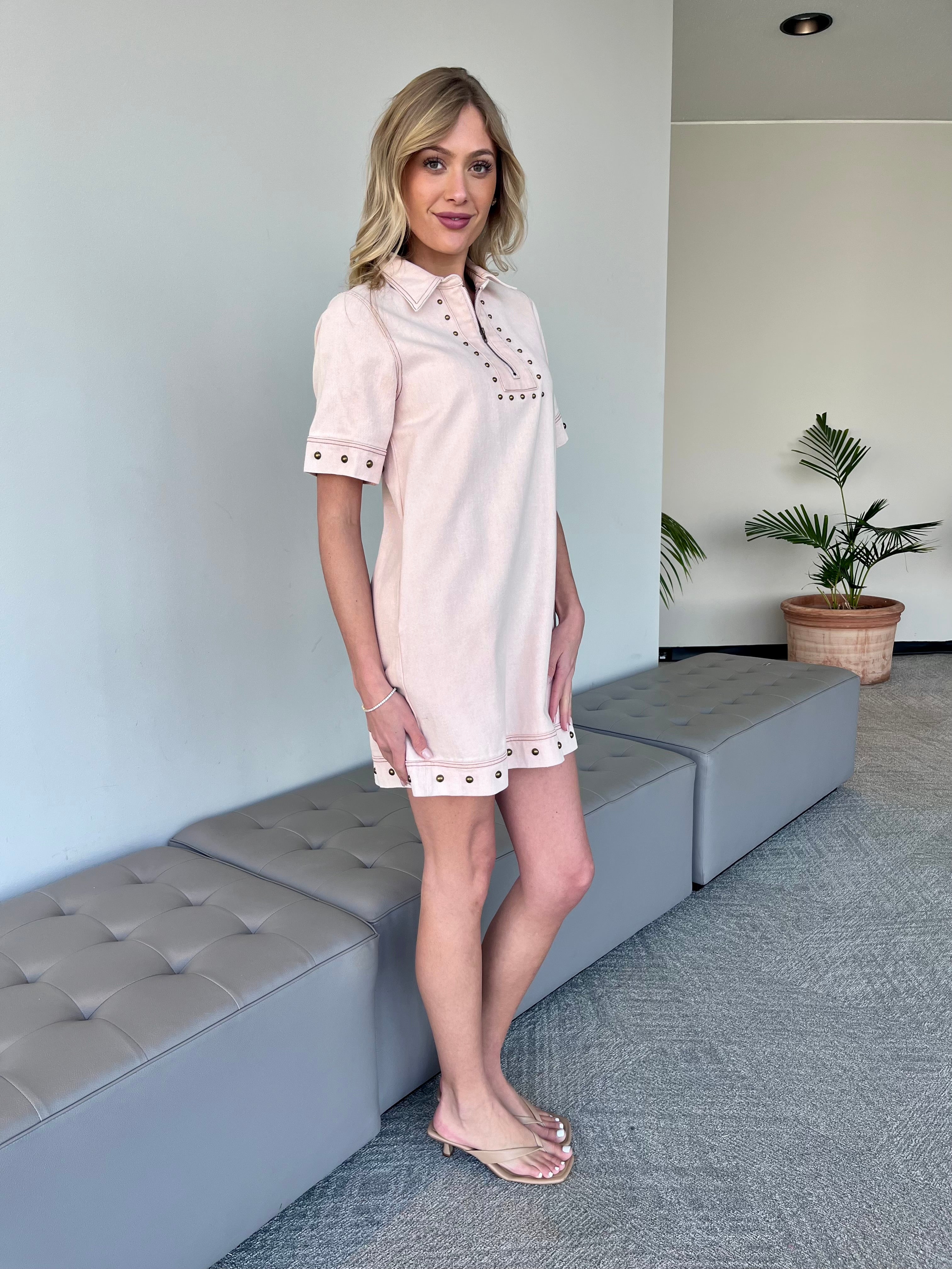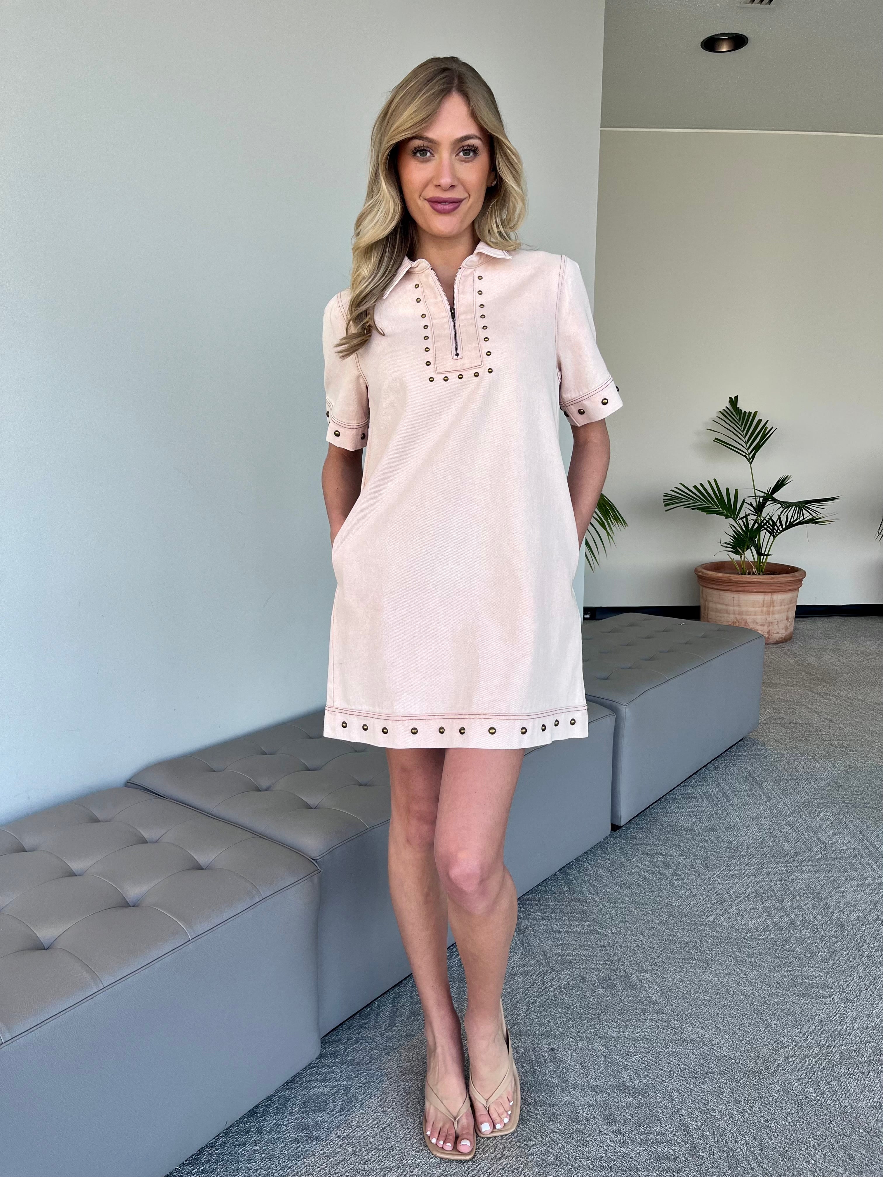 Chic, polished, and effortlessly feminine, this blush studded shift dress is the perfect blend of classic and modern style. Designed with a soft, suede-like finish, it features a flattering relaxed silhouette, a zip-front neckline with a structured collar, and gold stud detailing along the neckline, sleeves, and hem for a subtle touch of edge. The easy shift fit offers all-day comfort while still looking elevated, making it perfect for brunch, workdays, or a casual night out. Pair it with sandals for a daytime look or dress it up with heels for a more refined feel.