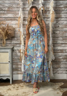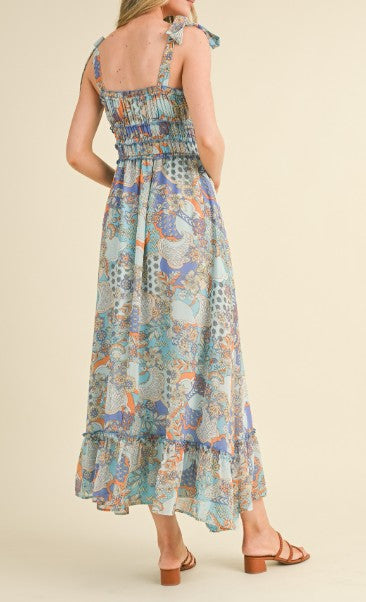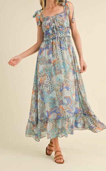 Float through the season in effortless style with our Boho Breeze Paisley Smocked Maxi Dress. Designed with a flattering smocked bodice and adjustable tie shoulder straps, this flowy maxi offers both comfort and charm. The soft, lightweight fabric features a dreamy paisley and floral print in soothing blue and earthy tones, while the ruffled hem adds a feminine, breezy finish. Perfect for brunch, beach vacations, outdoor events, or everyday wear, this dress pairs beautifully with sandals or wedges for an easy, polished look.