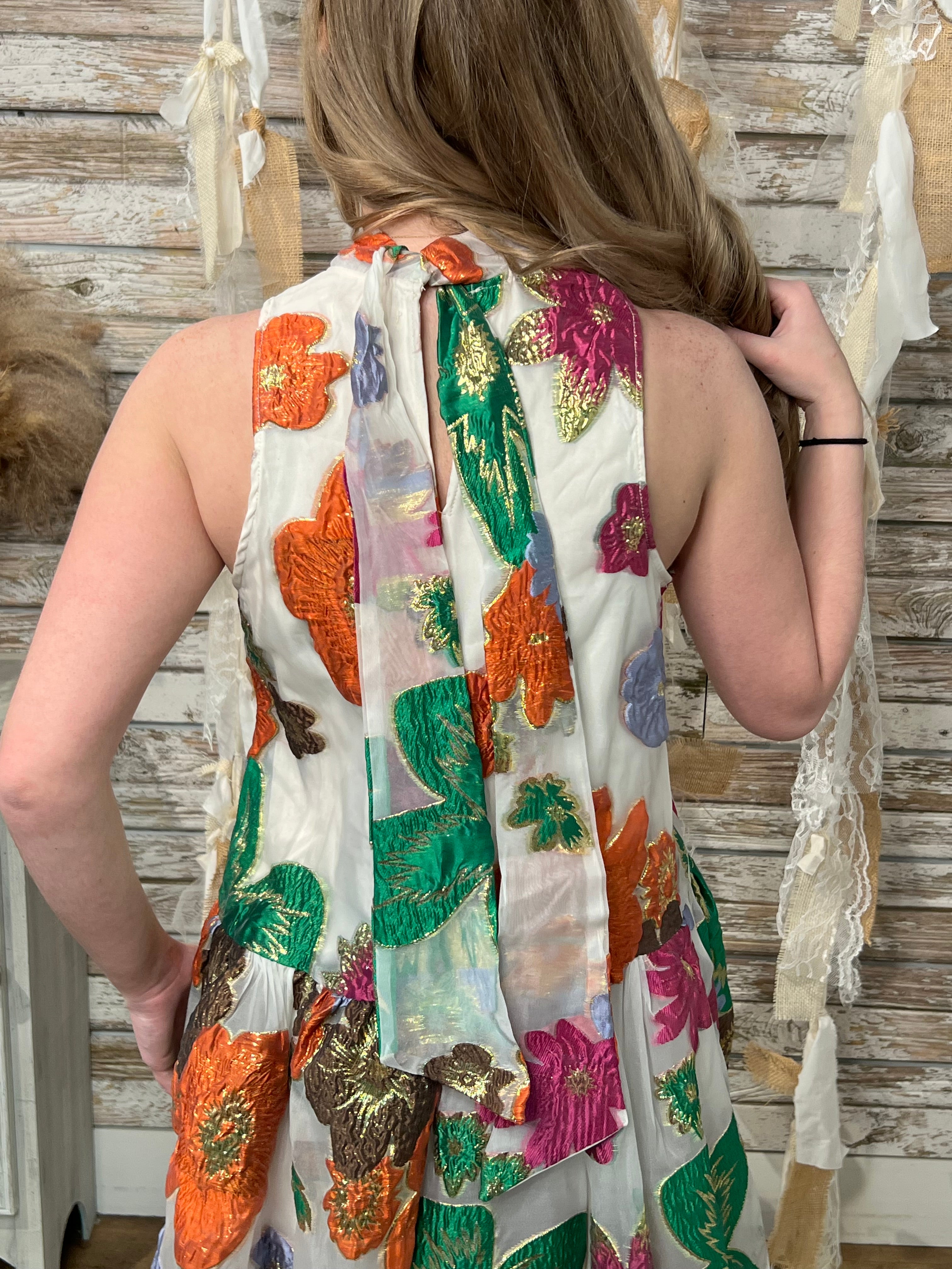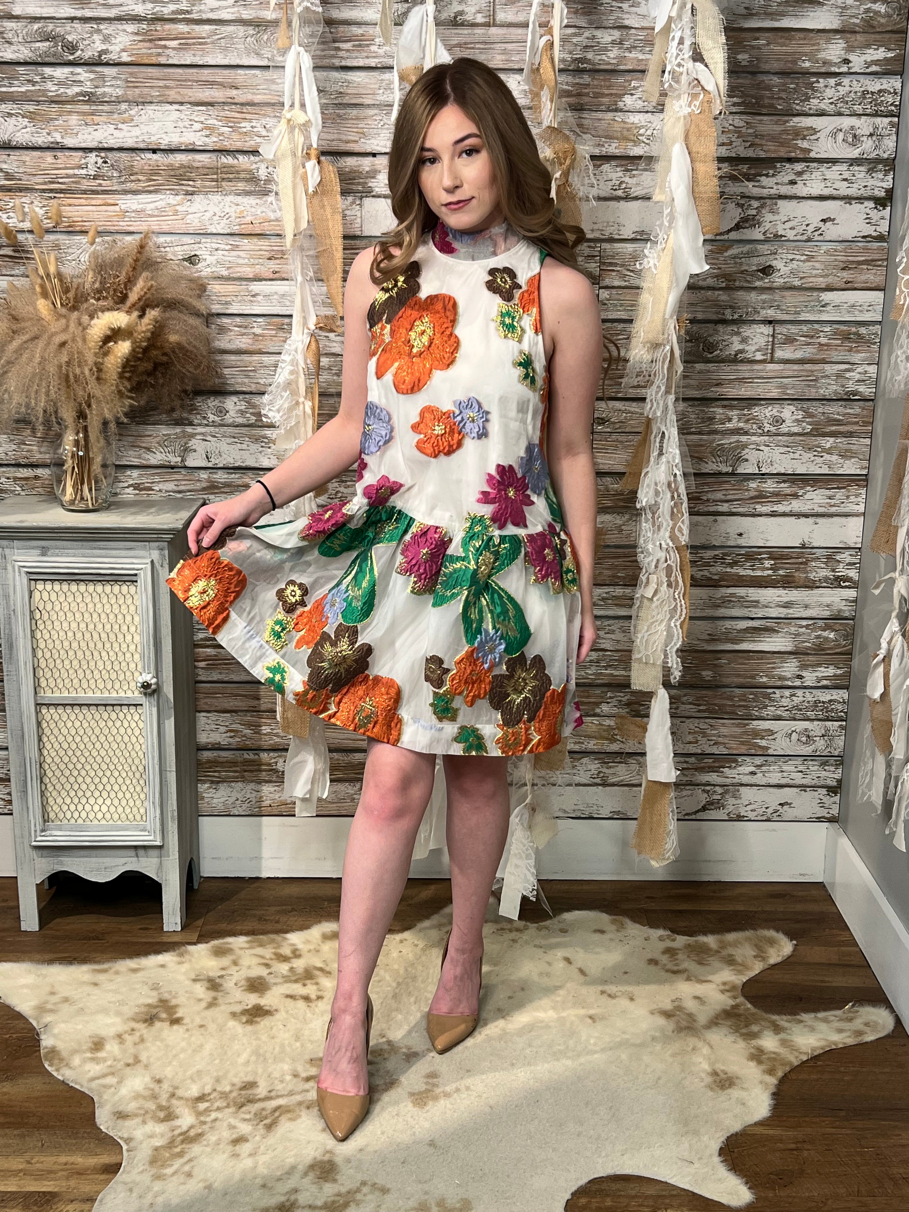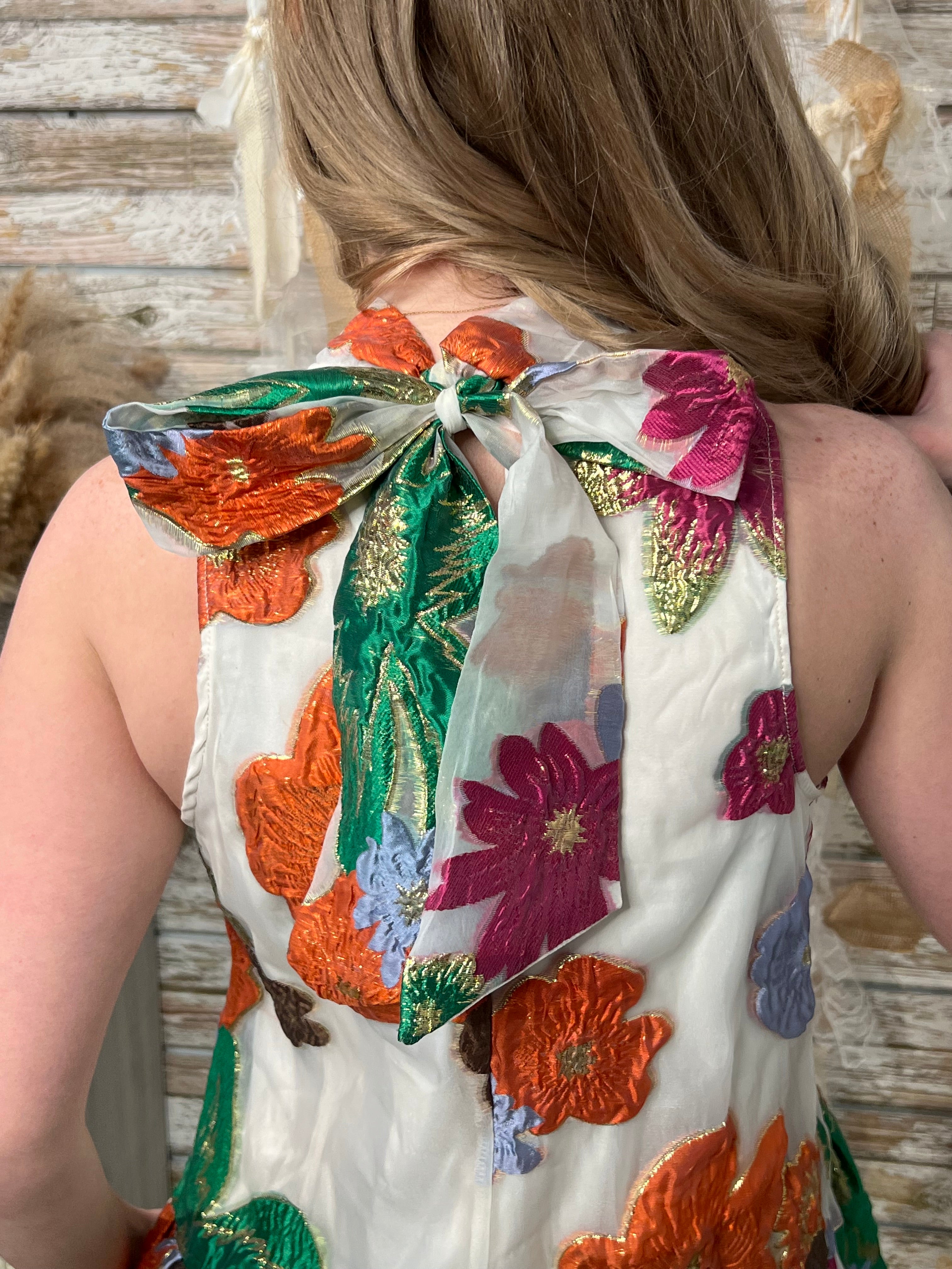 Turn heads in this stunning embroidered floral dress designed for special moments and standout style. Featuring vibrant textured blooms in rich shades of orange, pink, green, and gold on a soft ivory backdrop, this sleeveless silhouette brings a playful yet elegant feel. The high neckline adds a polished touch, while the statement bow tie back creates a feminine, eye-catching finish. A lightly flared skirt gives it graceful movement, making it perfect for weddings, showers, brunches, and spring events. This piece blends romantic charm with boutique-level uniqueness your customers will love.