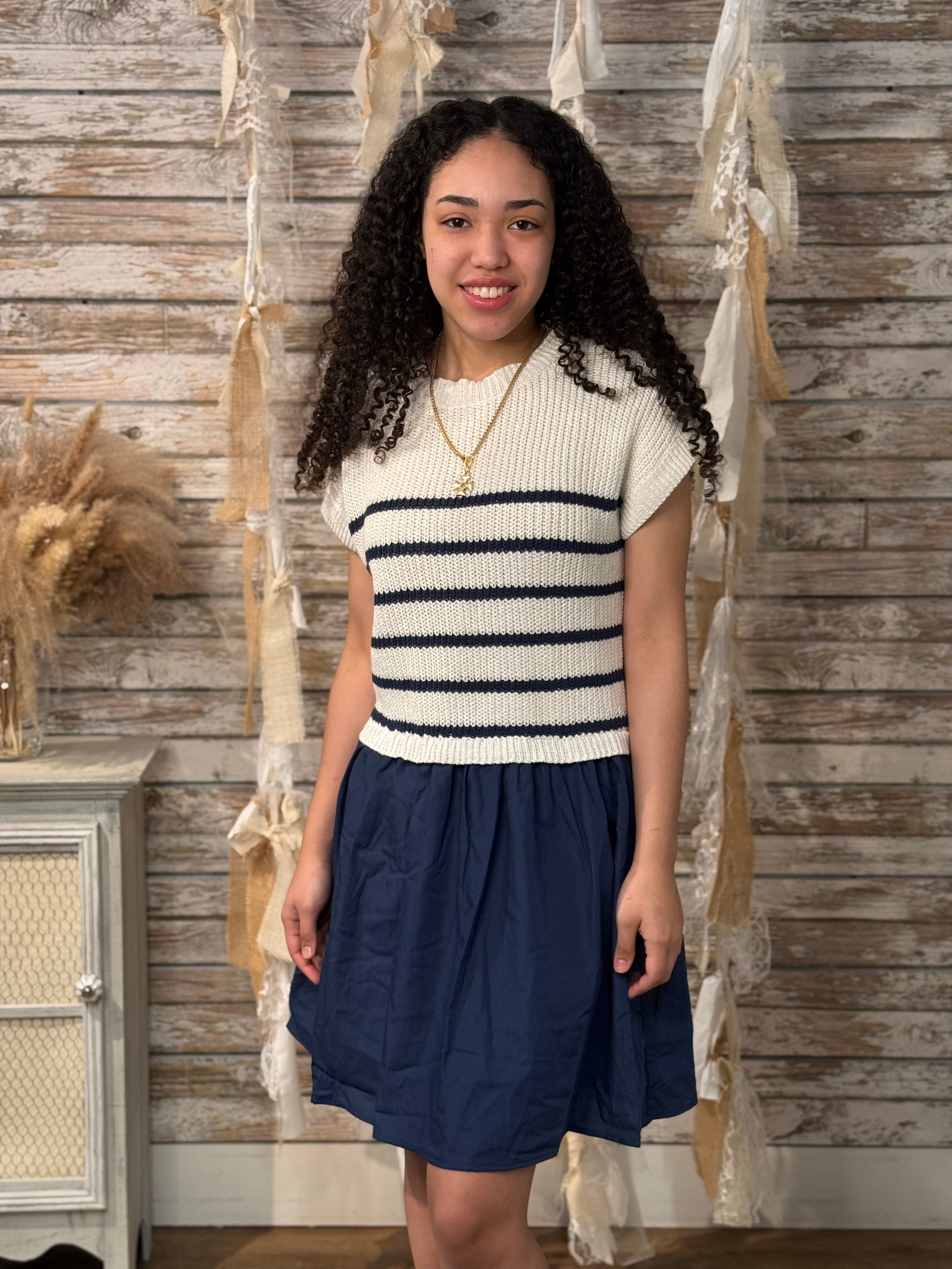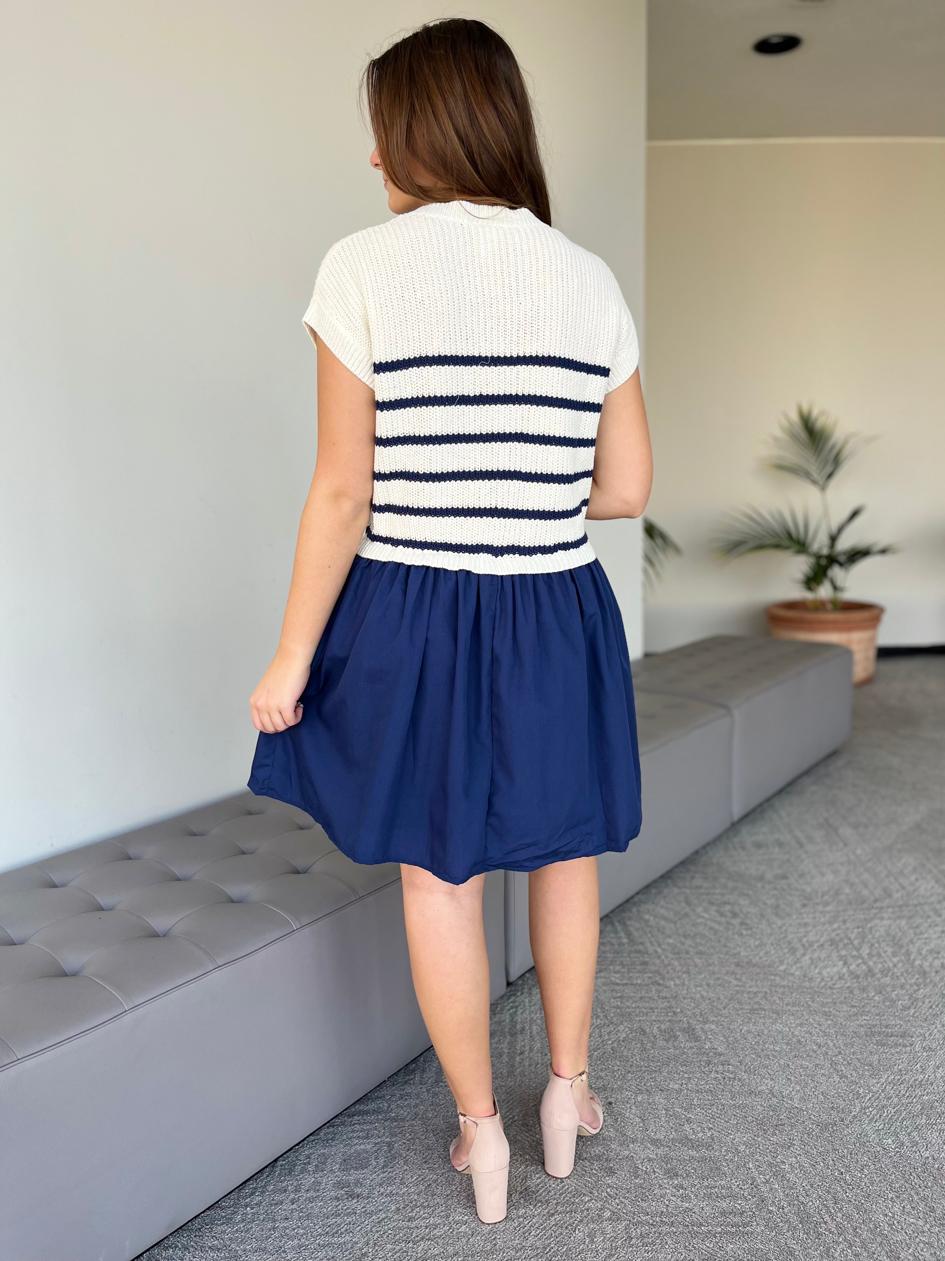 Classic meets playful in this ivory and navy stripe sweater dress, designed for an effortlessly polished look. The soft knit bodice features timeless horizontal stripes and cap sleeves for a flattering, comfortable fit, while the gathered navy skirt adds movement and a feminine touch. This mixed-texture design creates the look of a perfectly styled outfit in one easy piece. Dress it up with heels for brunch or special occasions or keep it casual with sandals for a chic everyday outfit.