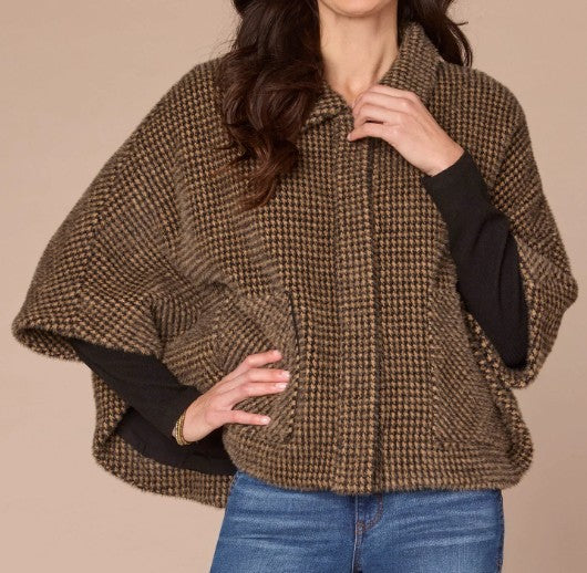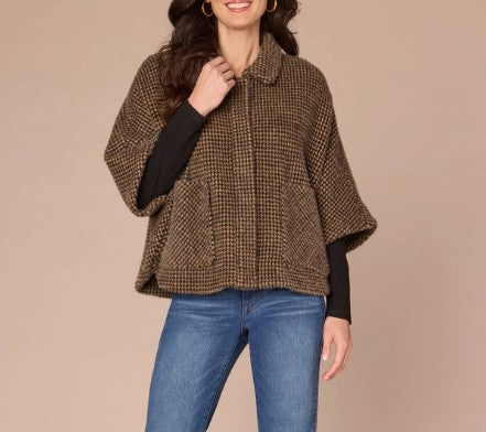 Wrap yourself in timeless charm with the Heritage Haven Cape Jacket. Designed in a cozy houndstooth weave, this chic silhouette blends vintage sophistication with modern ease. The relaxed cape sleeves and collared neckline offer an effortlessly layered look, while front patch pockets add a touch of practicality and polish. Perfect for elevating denim or topping off your favorite turtleneck — this piece is fall layering perfection with a heritage twist.