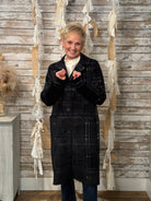 Classic meets contemporary in the London Noir Coatigan. Crafted in a plush knit with a subtle plaid texture, this longline silhouette delivers polished warmth without the bulk of a traditional coat. The tailored collar and front patch pockets add refined structure, while the velvety finish lends a hint of sophistication. Effortlessly chic over denim or dresses — it’s the layer that turns every outing into a statement.