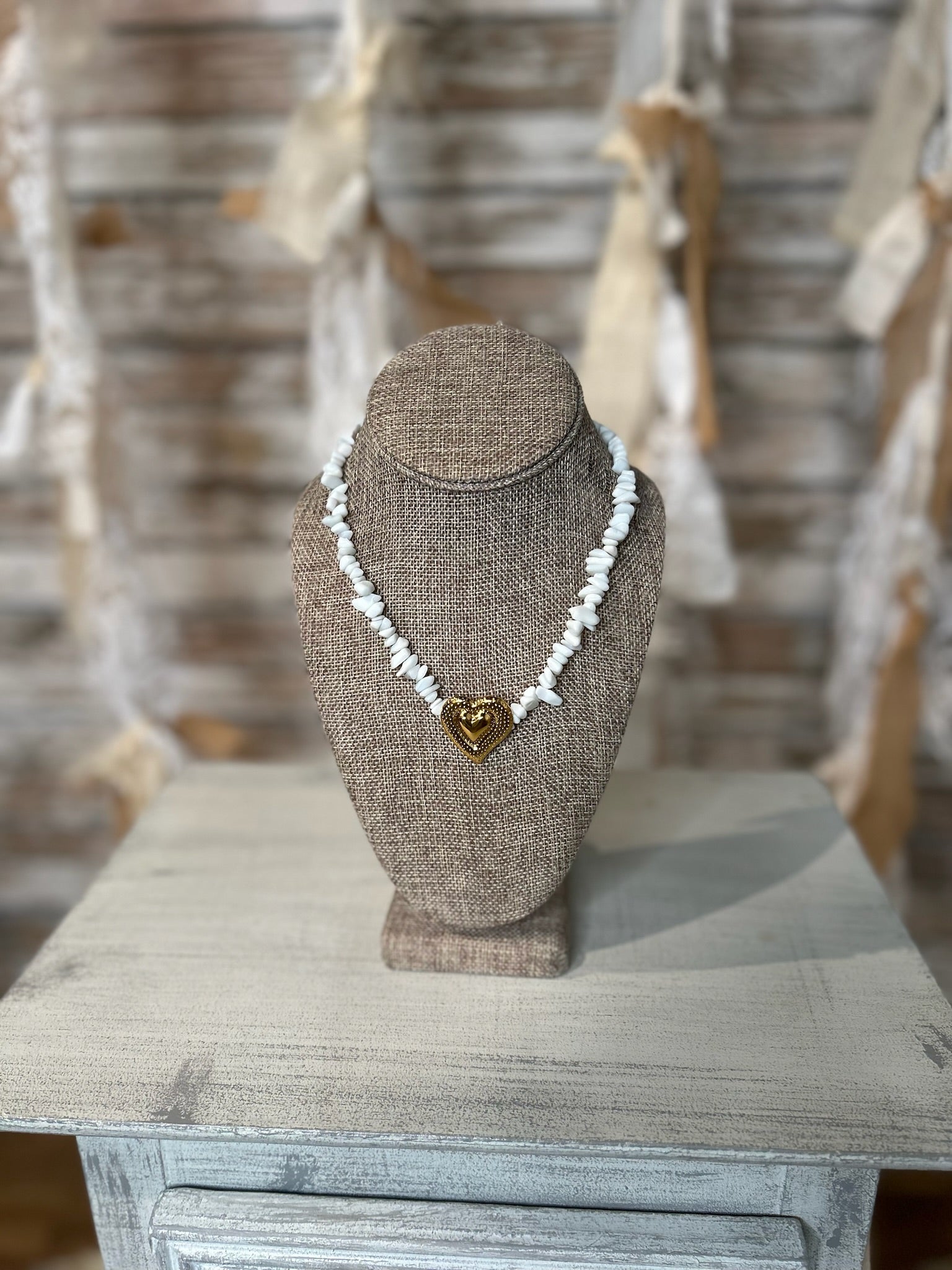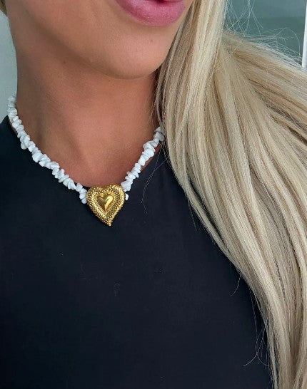 The Carly Heart Necklace is bold, golden love with a beachy twist. Featuring organic white shell-like chips strung together and anchored by a textured, oversized golden heart pendant, this piece brings effortless charm and statement-making style to your neckline. Perfect for dressing up a casual look or adding personality to eveningwear.