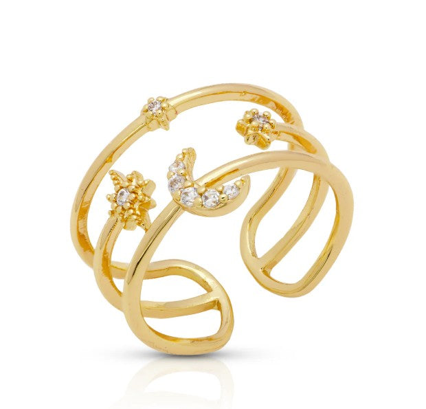 Channel the magic of the night sky with the Celestial Dreams Ring. Featuring a crescent moon and twinkling star accents, this open gold band wraps your finger in cosmic charm. Delicate CZ stones add a touch of sparkle for a look that's dreamy, dainty, and destined to shine.