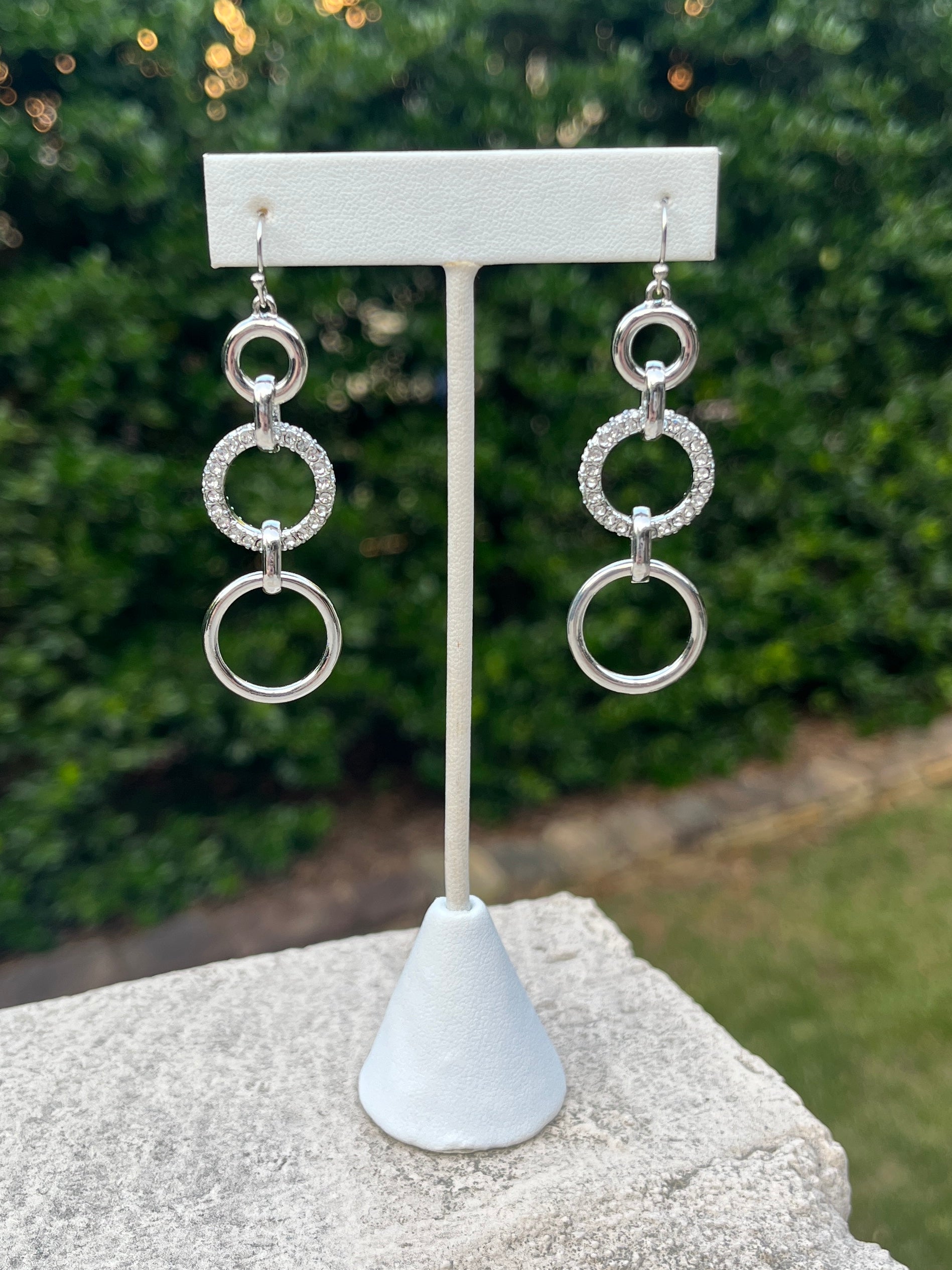 Three tiers of glam in one dazzling drop—these silver-tone earrings feature linked open circles, with a center ring encrusted in rhinestones for that perfect pop of shimmer. Sleek, modern, and made to shine from day to night.