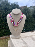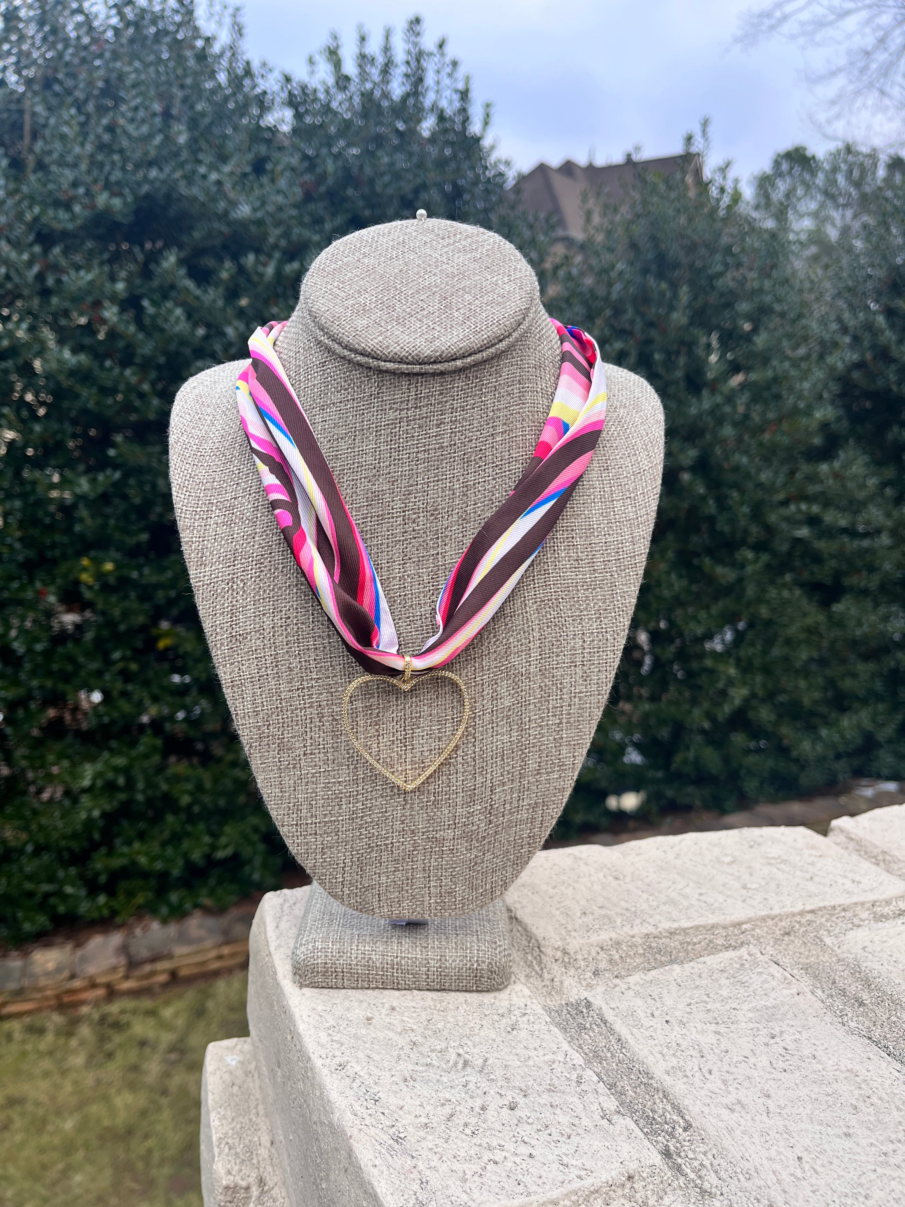 Playful and feminine, this scarf necklace features a vibrant printed fabric band paired with a sparkling CZ open heart pendant for a romantic statement look. The silky scarf design brings a pop of color and softness around the neckline, while the delicate crystal-lined heart adds just the right touch of shimmer. Lightweight and easy to style, this unique accessory instantly elevates simple tops, dresses, and layers with charm and personality. A perfect piece for everyday wear, gifting, or adding a sweet, stylish finish to any outfit.