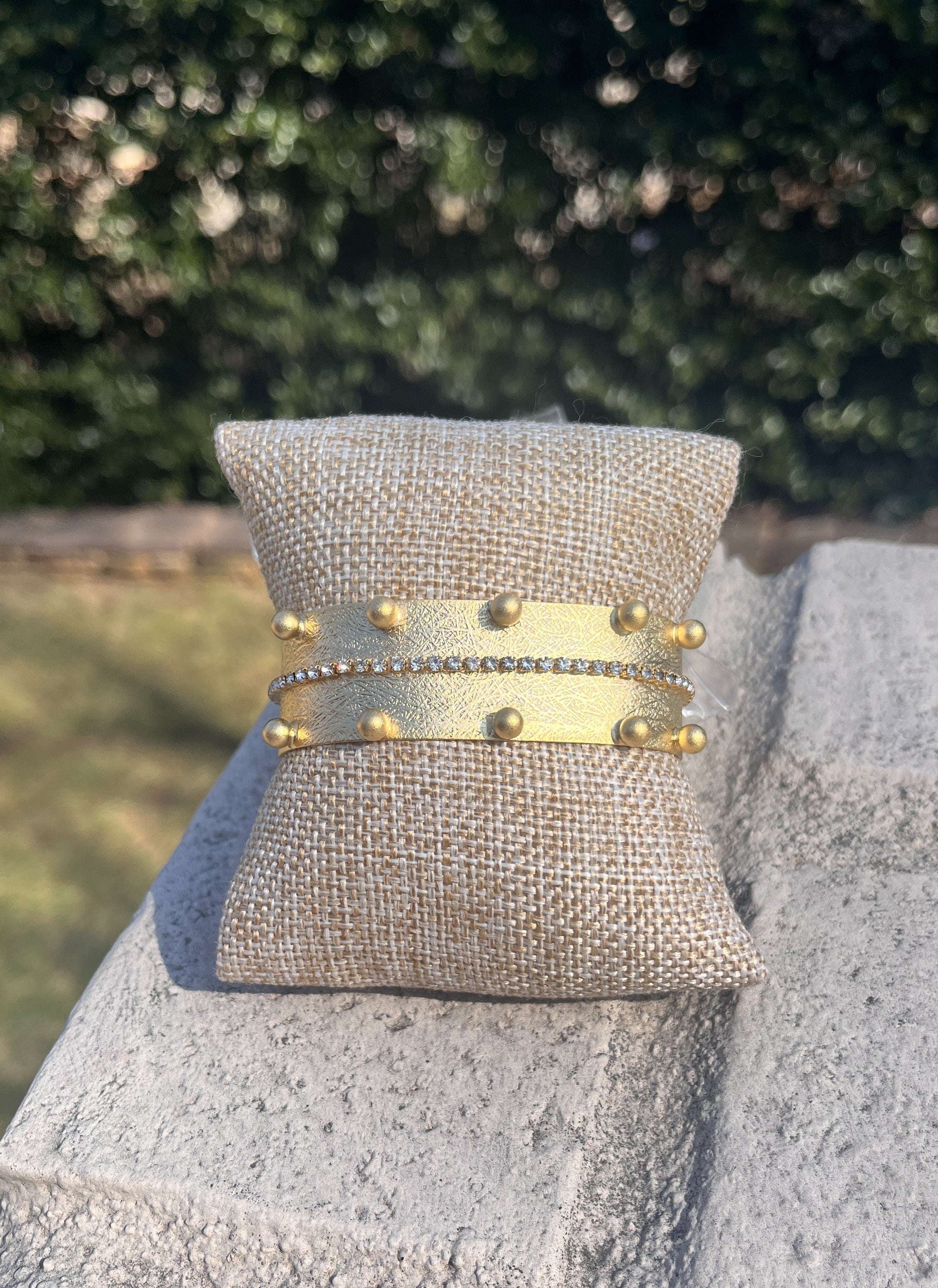 Elevate your accessory game with the Farrah Diamond Studded Gold Cuff Bracelet, a bold statement piece designed to add instant sophistication to any look. This textured gold-tone cuff features raised stud accents and a sparkling row of crystal details for the perfect blend of edge and elegance. Its structured, slip-on design makes it easy to style solo or stack with your favorite bracelets for a layered, on-trend finish. Perfect for dressing up everyday outfits or adding polish to a night-out ensemble.