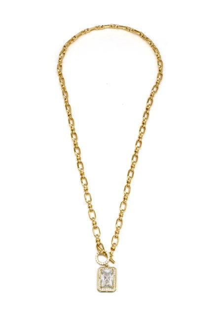 Elegance meets edge in the Golden Era Necklace. This timeless piece features a bold gold link chain and a sparkling emerald-cut cubic zirconia charm, finished with a classic toggle clasp. Whether worn solo or layered, it's your new go-to for effortless glam.