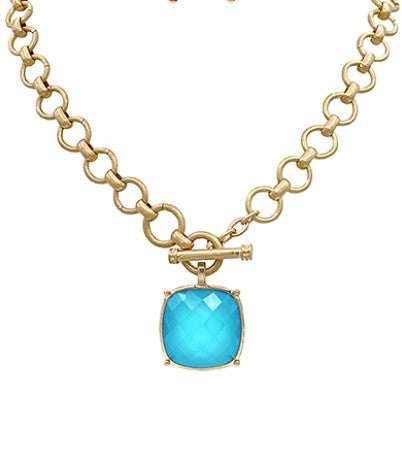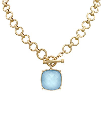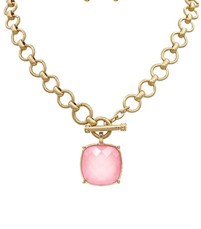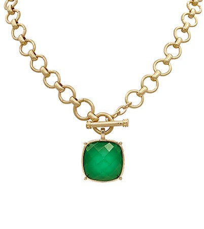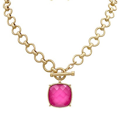 Bold meets brilliant in the Luxe Link Gem Toggle Necklace. Featuring a chunky gold-tone chain and a faceted cushion-cut pendant in a range of rich, radiant hues, this piece is finished with a front toggle clasp for effortless style. Whether you go for classic blush, vibrant fuchsia, emerald green, serene blue, or striking turquoise, this necklace brings a polished pop to any neckline.