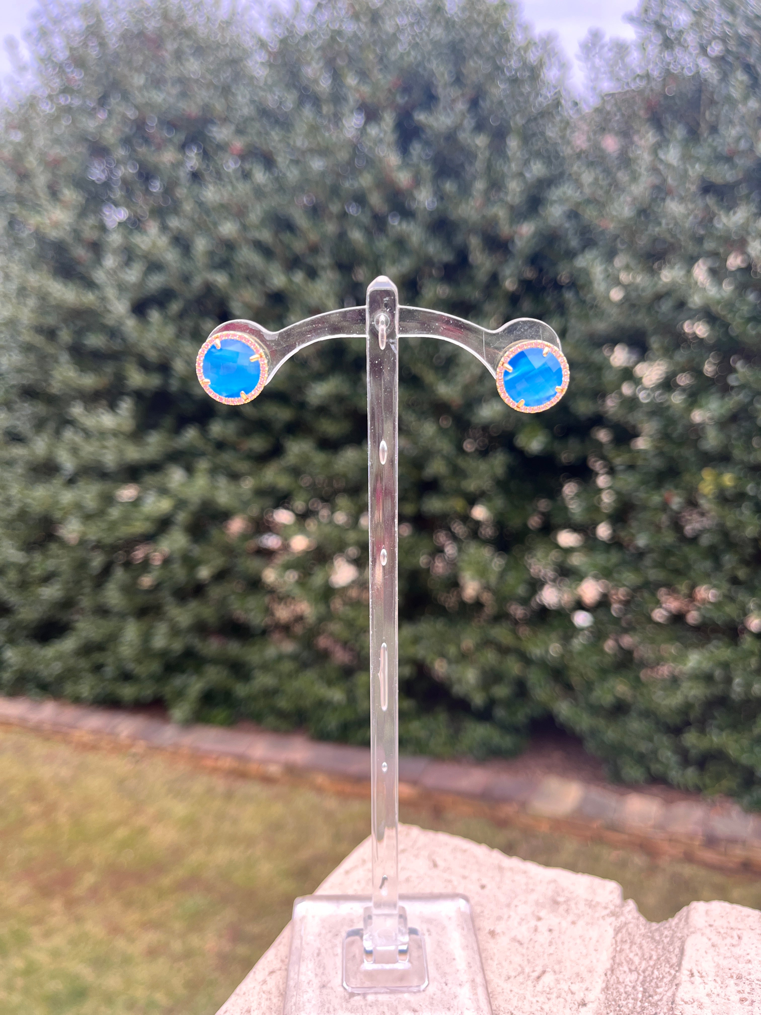 Add a pop of color and sparkle with these radiant gemstone stud earrings. Featuring a vibrant round blue stone framed by a delicate halo of shimmering CZ accents, this timeless pair blends everyday elegance with eye-catching shine. The classic stud silhouette makes them perfect for daily wear, while the rich color and subtle sparkle elevate any outfit from casual to polished. Lightweight, versatile, and effortlessly chic, these earrings are a must-have staple for any jewelry collection.