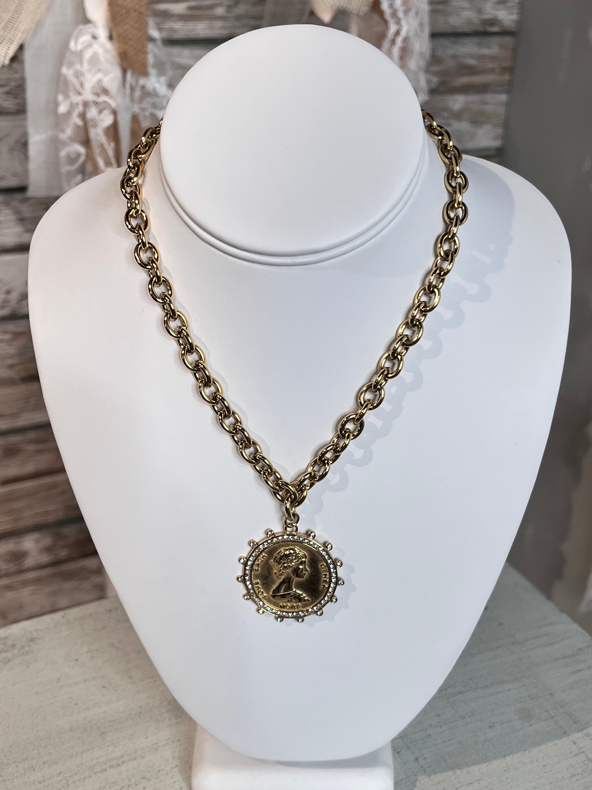 Timeless with a touch of royalty—our Regal Charm Coin Necklace features a bold gold chain and an antique-inspired coin pendant framed with delicate accents. Whether styled solo or layered with your favorite chains, this statement piece adds vintage allure and modern sophistication to any outfit. A must-have for lovers of classic style with an edge!