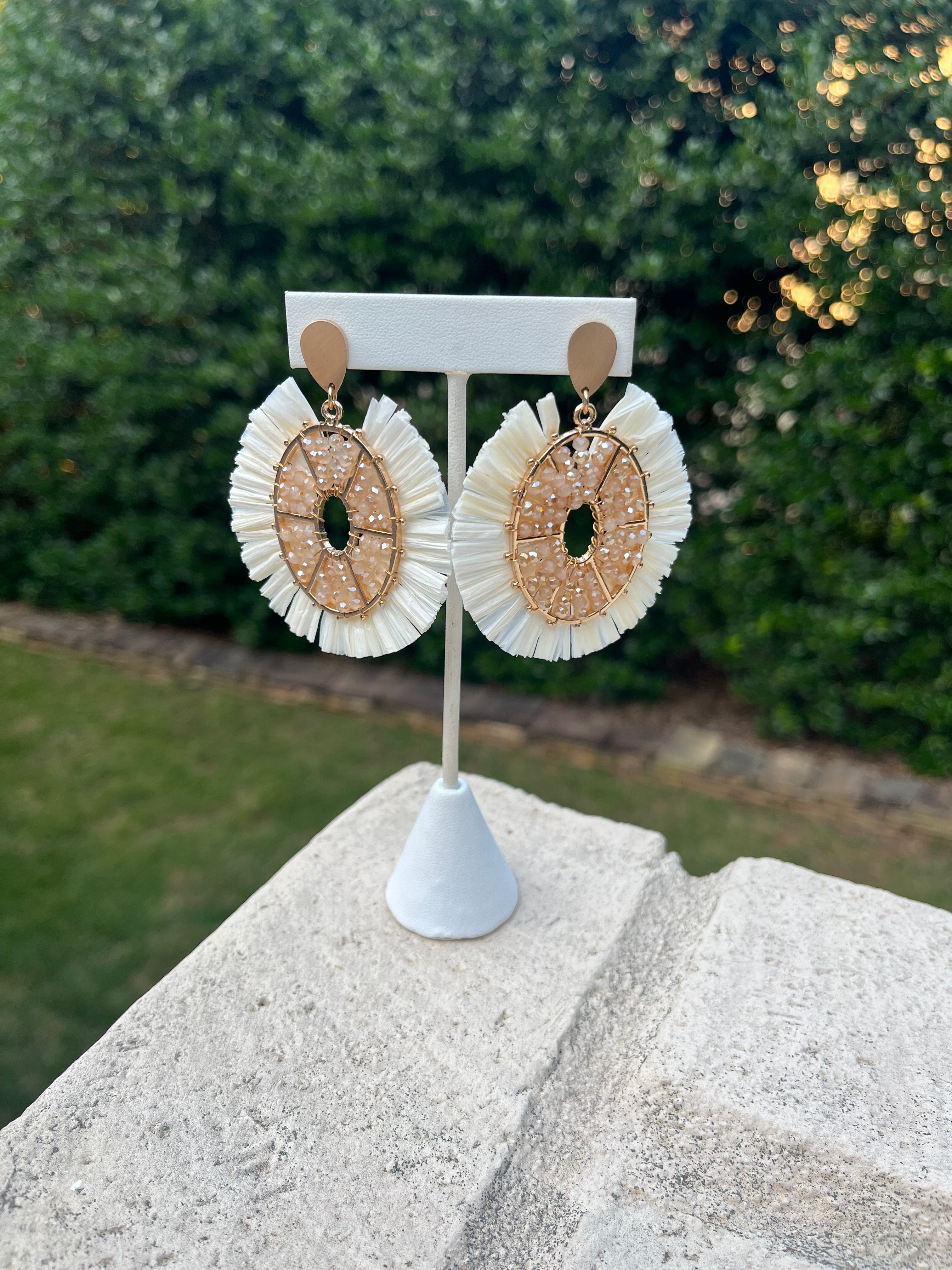Bold and beautiful, these statement earrings feature a fan of raffia fringe surrounding a beaded openwork center, all anchored by a soft matte gold teardrop post. Available in smoky grey or creamy ivory, they're the perfect mix of earthy texture and effortless elegance.