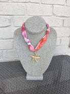 Bring a touch of coastal beauty to your look with this starfish pendant scarf necklace. Designed with a soft, silky scarf band in warm pink and coral tones, this piece is finished with a textured gold starfish charm that adds a playful, beach-inspired statement.