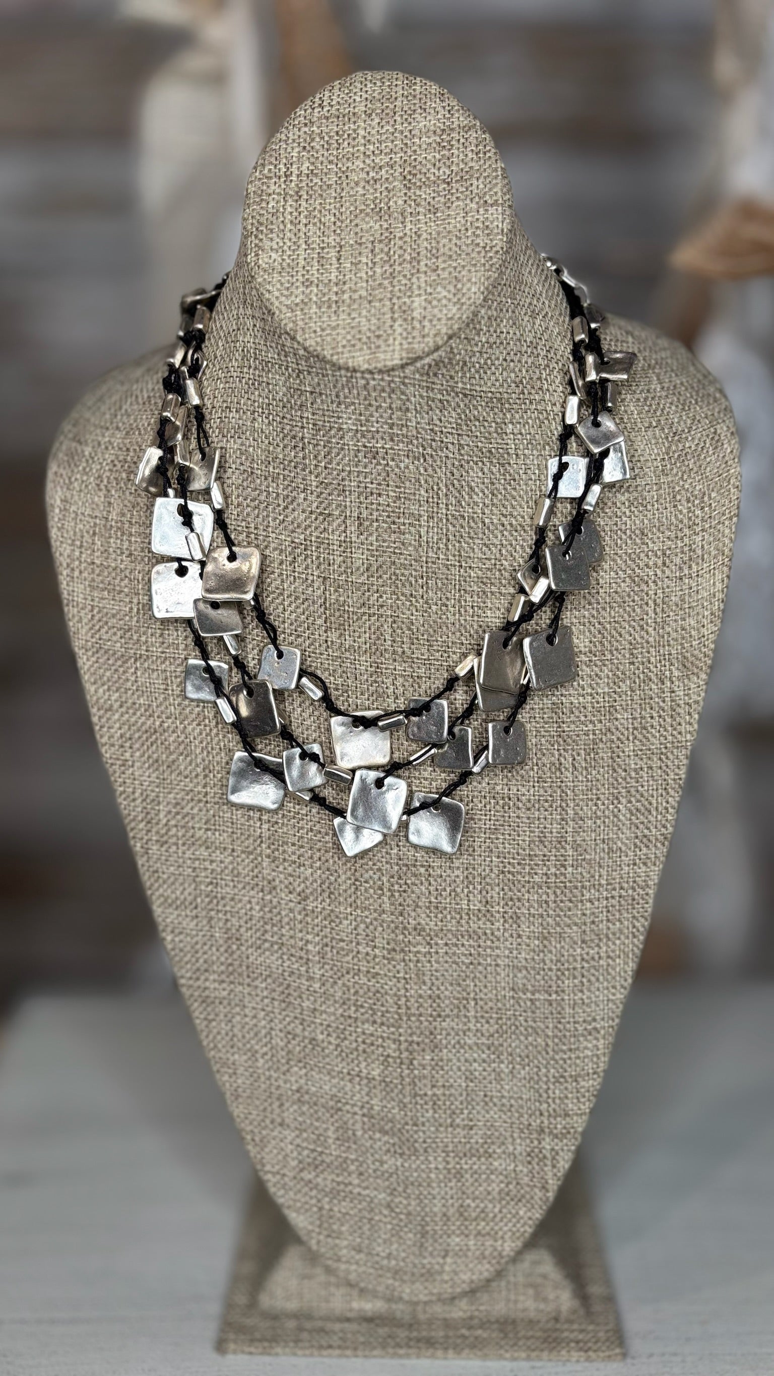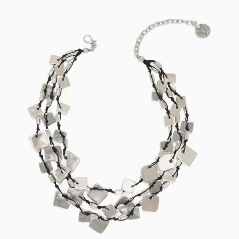 Channel effortless artistry with our Silver Drift Layered Necklace. This handcrafted piece features cascading strands of black cord adorned with organic silver-plated squares that shimmer with every movement. The modern geometric design blends bohemian charm with contemporary edge, making it a stunning statement piece for any outfit.