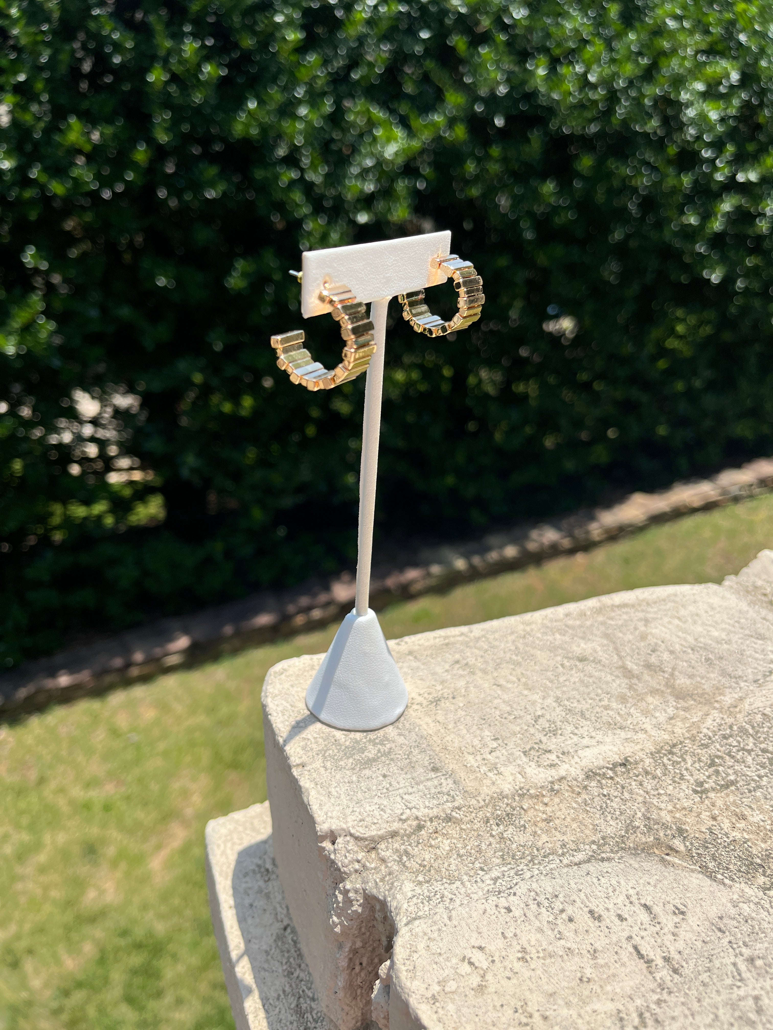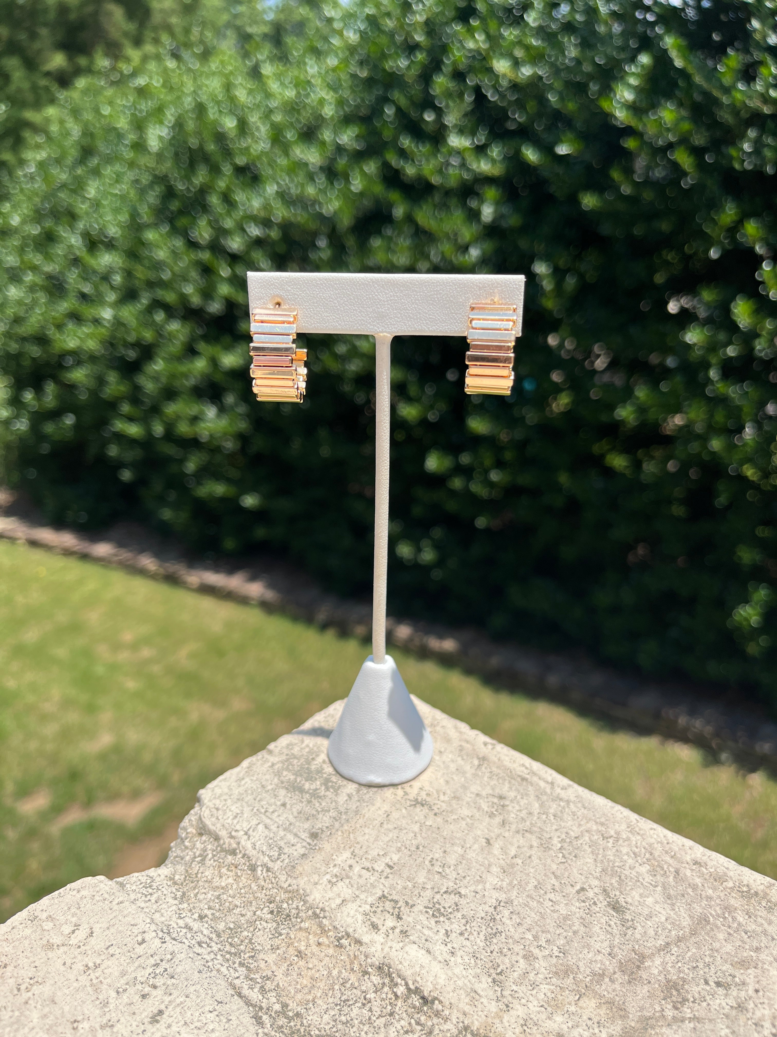 Sleek meets sculptural in these modern gold-tone hoop earrings, crafted with stacked rectangular bars for a bold, architectural edge. Lightweight with a luxe finish, they’re perfect for powering up your day-to-night looks with minimal effort and maximum style.