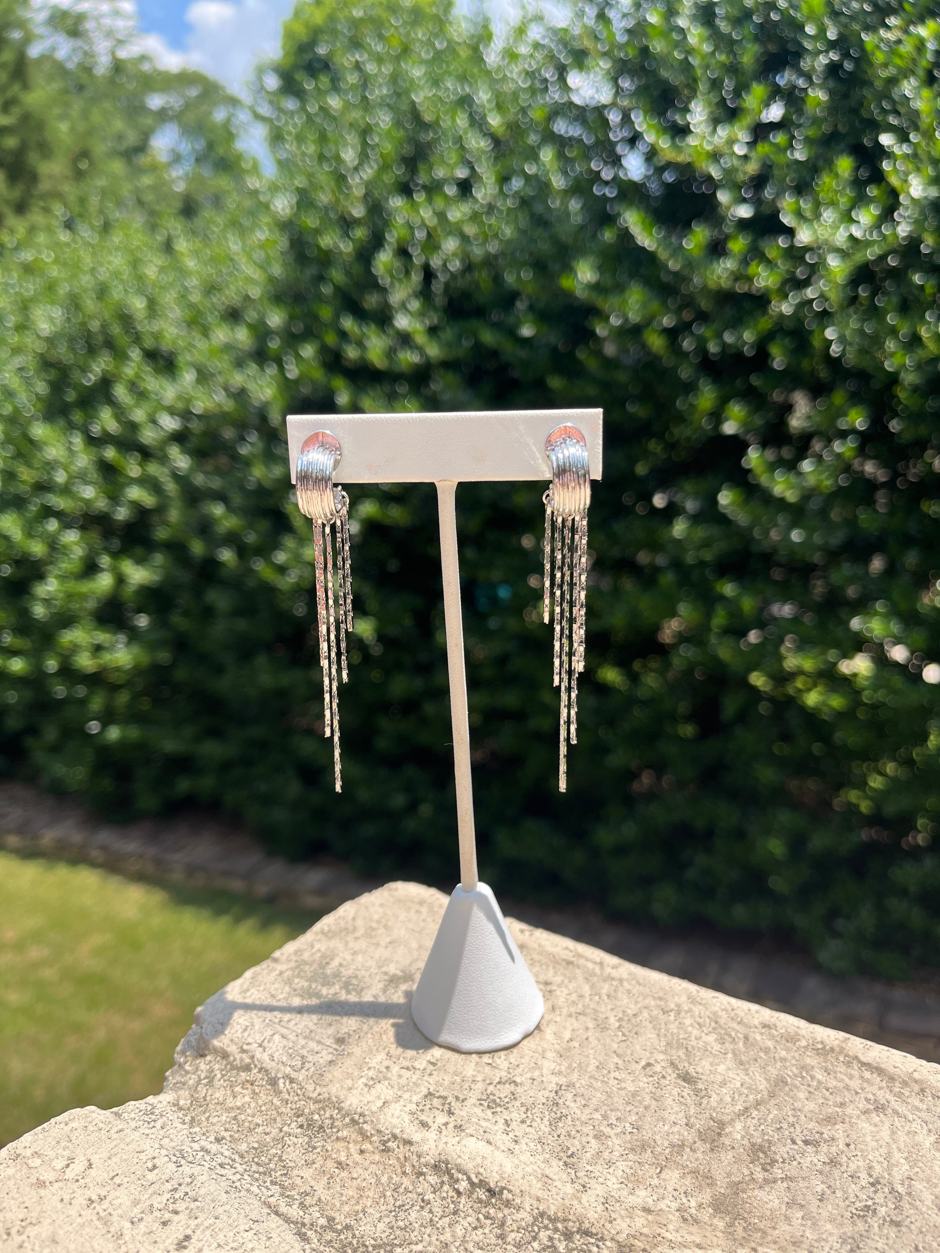 Turn heads with every shimmer—these sleek silver-tone earrings feature cascading chain fringe that moves with effortless grace. Lightweight and luminous, they add instant drama to any look, from cocktails to candlelit dinners.