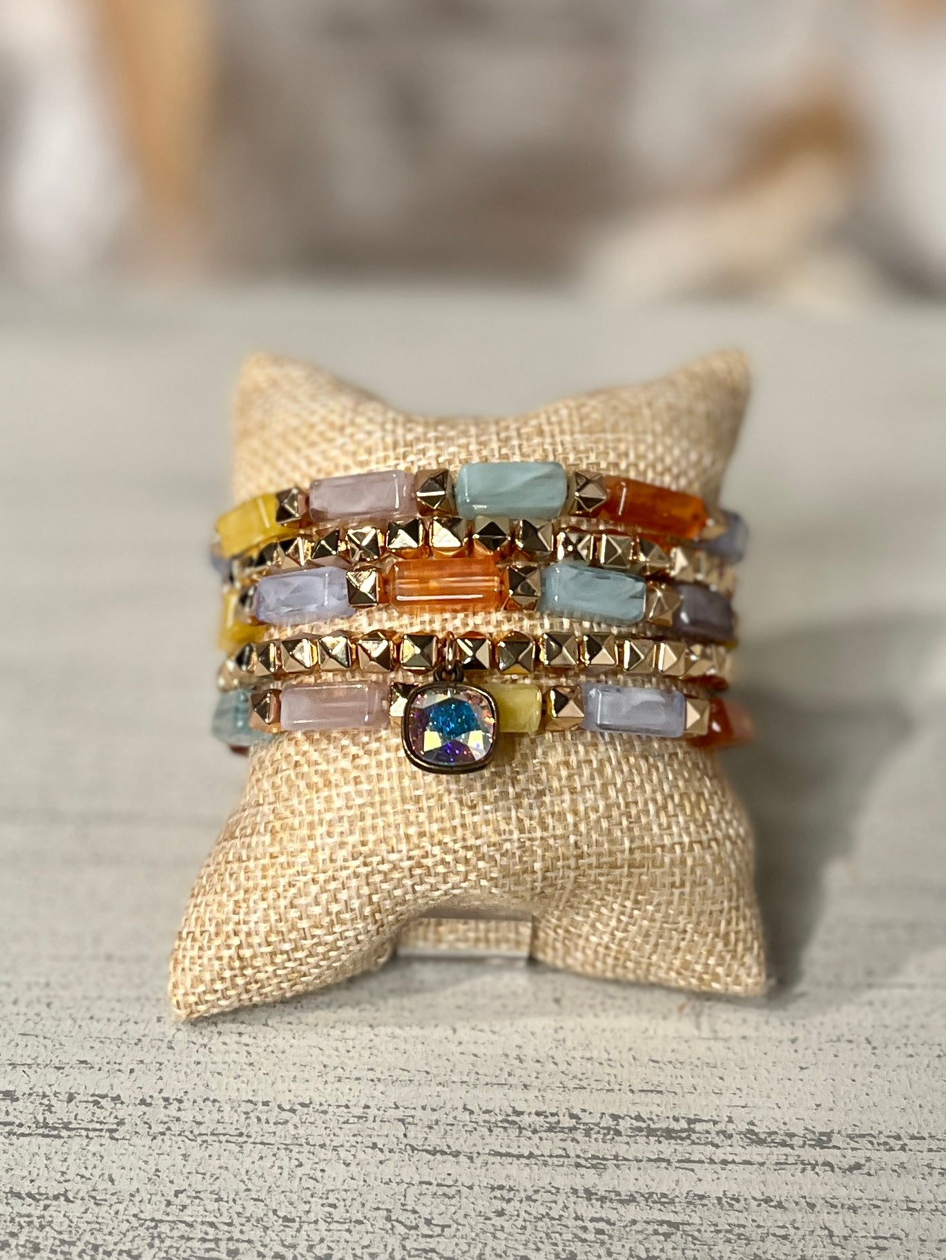 Vibrant and full of energy—our Sunset Glow Stacked Bracelet Set features rich, square acrylic beads in sunset-inspired hues, paired with edgy gold studs and a sparkling Austrian crystal charm. The perfect pop of color for any wrist stack, this playful set adds a fun, modern twist to both casual and dressy looks.