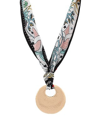 Elevate your everyday style with this Textured Round Pendant Scarf Necklace, designed to add effortless sophistication to any outfit. Featuring a soft printed fabric scarf paired with a hammered-style round metal pendant, this lightweight accessory brings modern texture and visual interest without feeling heavy. The adjustable tie closure allows for a customizable fit, making it easy to style with tops, sweaters, and dresses.