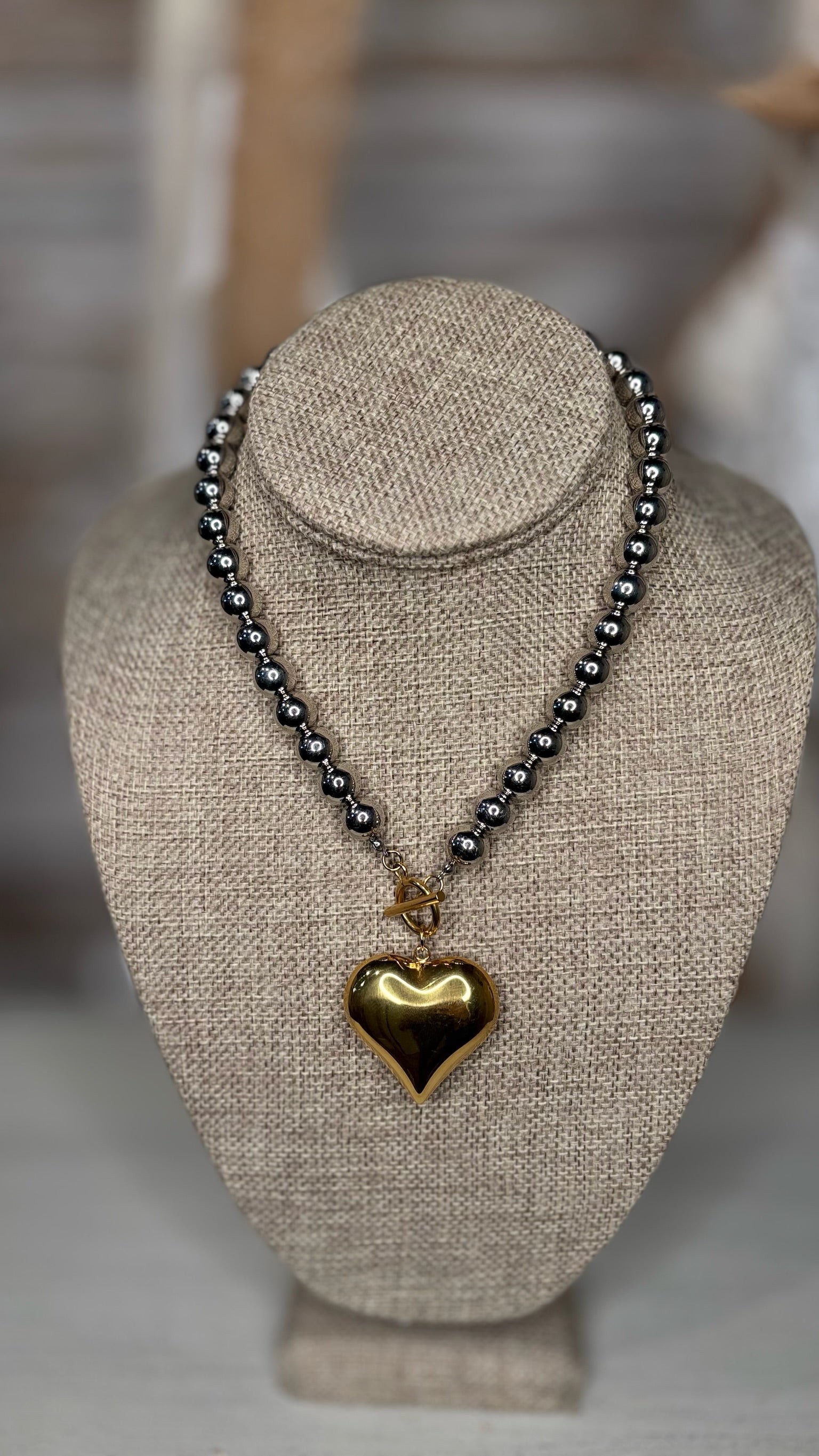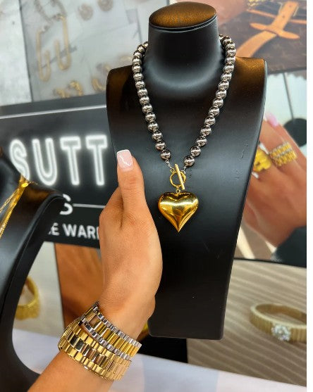 Statement sparkle meets modern romance in The Glam Heart Necklace. Featuring bold silver beads and a gleaming gold heart pendant, this two-tone beauty adds instant glamour to any look. The oversized toggle clasp gives it a touch of edge, while the sculptural heart brings timeless femininity. Perfect for layering or wearing solo when you want to turn heads.