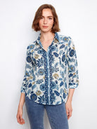 Light, airy, and beautifully detailed, this printed cotton voile blouse is the perfect blend of comfort and effortless style. Featuring an intricate blue floral pattern with a contrasting border along the button front, it brings a fresh, timeless feel to your wardrobe. The breathable cotton voile fabric offers a soft, lightweight drape, while the classic button-up design and roll-ready sleeves make it easy to style for work or weekend wear. Pair it with denim or white bottoms for a polished, easygoing look that feels crisp and feminine.