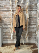 Sleek meets sophisticated in the Camel Chic Moto jacket — a tailored blend of moto edge and timeless elegance. With its structured silhouette, modern zip details, and warm camel hue, this versatile piece pairs effortlessly from office houndstooth to weekend denim.