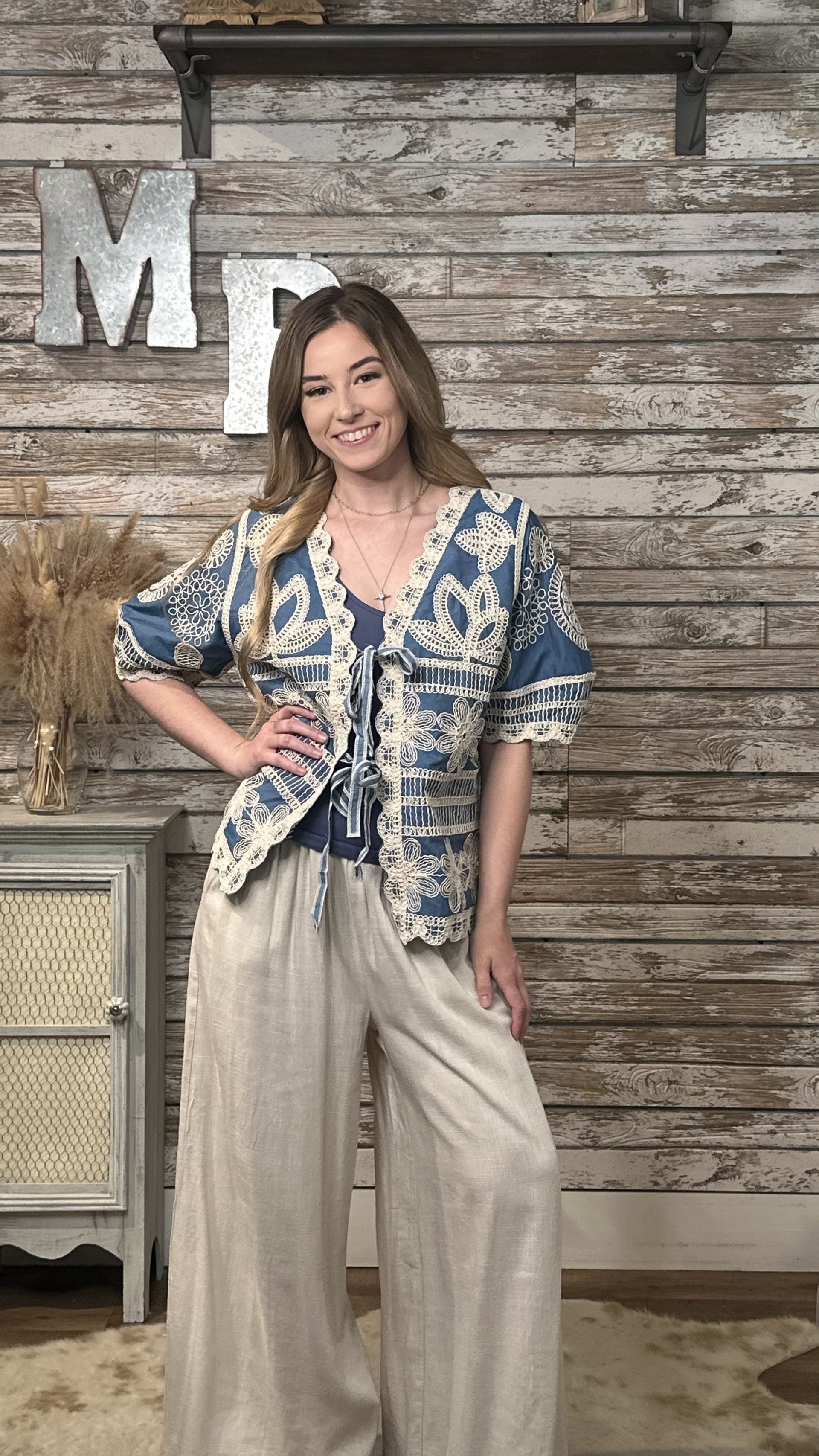 Denim Blue Crochet Lace Tie Front Layering Jacket