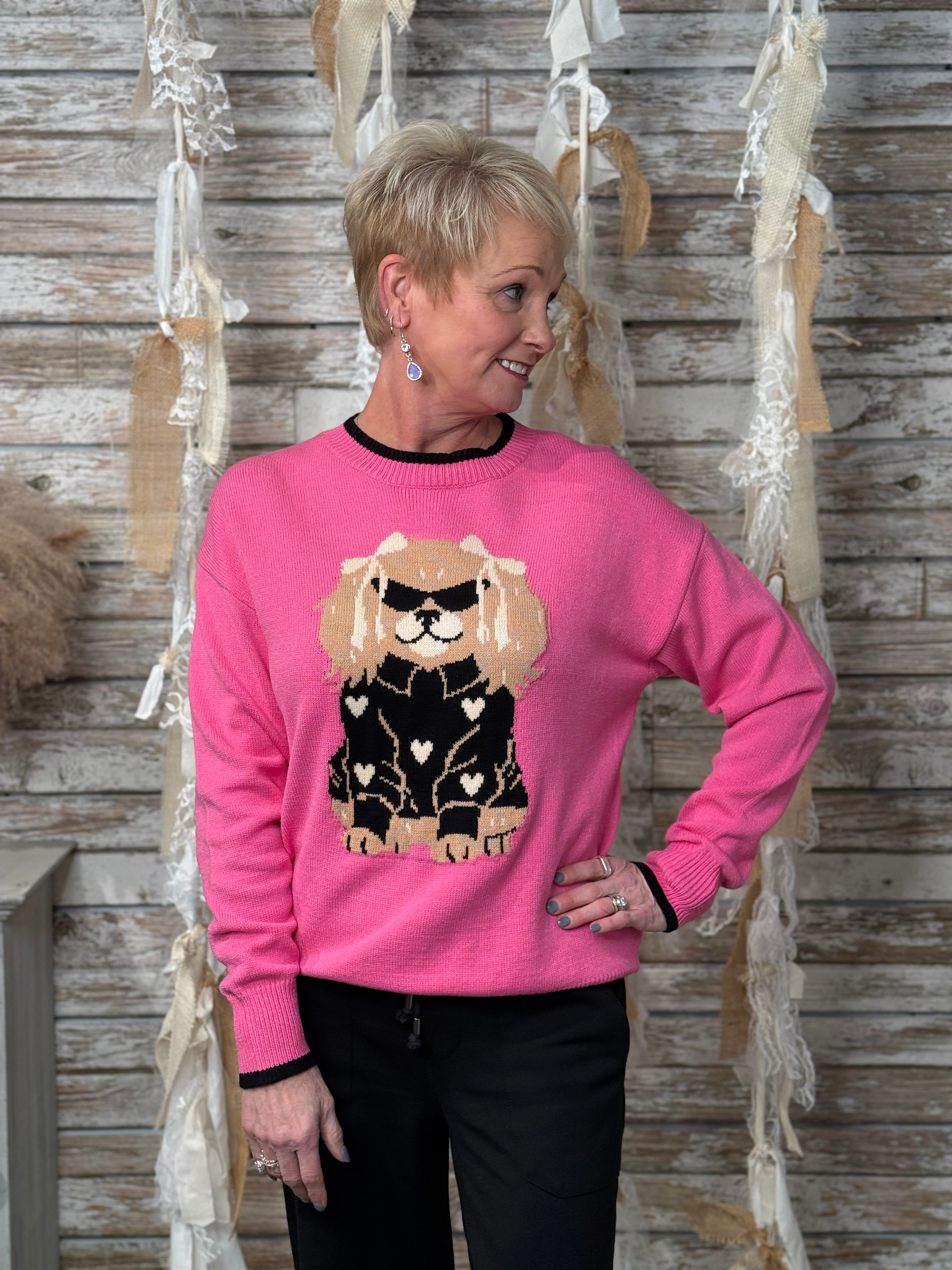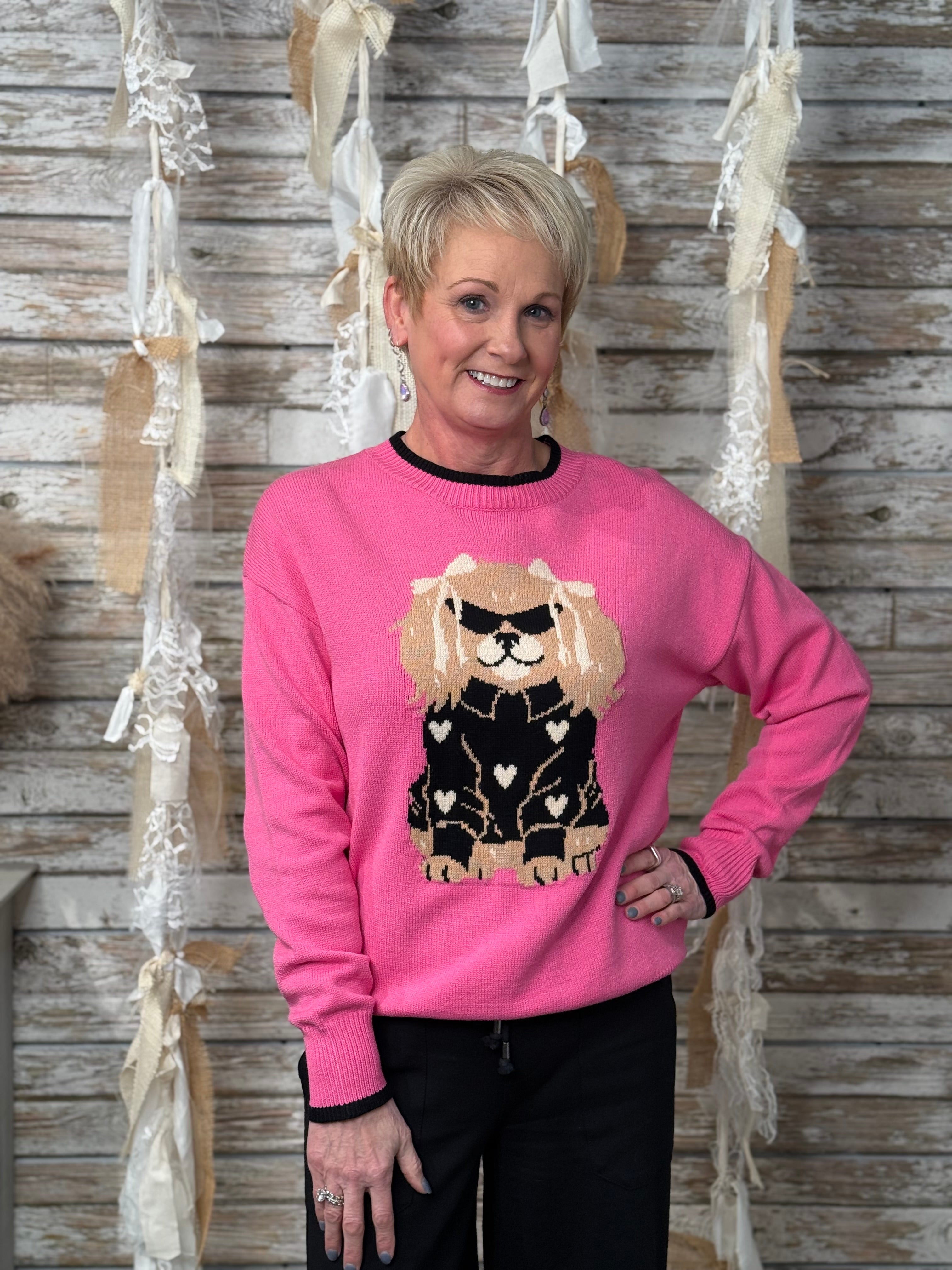 Add a fun, fashion-forward touch to your cold-weather wardrobe with the Dixie the Dog Sweater. Featuring an adorable dog graphic dressed in a chic outfit with heart details, this statement sweater brings playful personality to cozy styling. Designed in a vibrant pink hue with contrast trim, it offers a comfortable fit that’s easy to wear all day.
