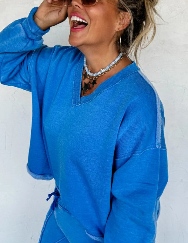 Slip into the Faded Feels V-Neck Pullover—where cozy meets carefree. With its washed, lived-in finish and slouchy drop-shoulder fit, this pullover feels like your favorite sweatshirt from day one. The relaxed V-neck adds a laid-back touch, making it perfect for layering over tanks, bralettes, or just worn solo. Whether you're lounging or out and about, this top brings the chill vibes in the boldest, happiest hue.
