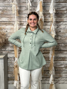 Polish your look with the Five Star Standout Tunic! Featuring a chic high neckline and a row of five statement buttons, this tunic blends structure with sophistication. Its tailored silhouette makes it versatile enough to dress up for the office or throw on casually for elevated everyday style. A timeless layer with just the right touch of modern edge.