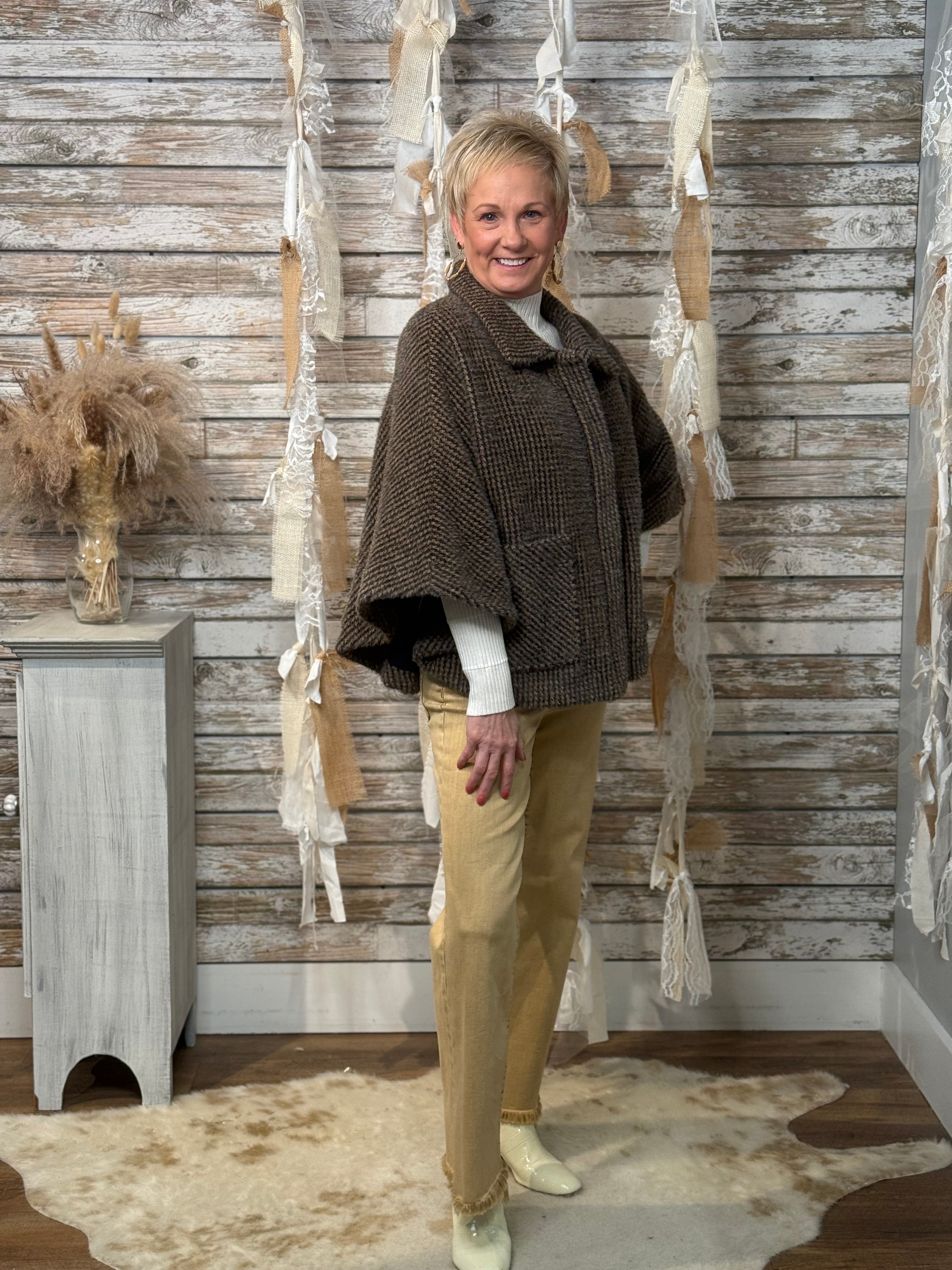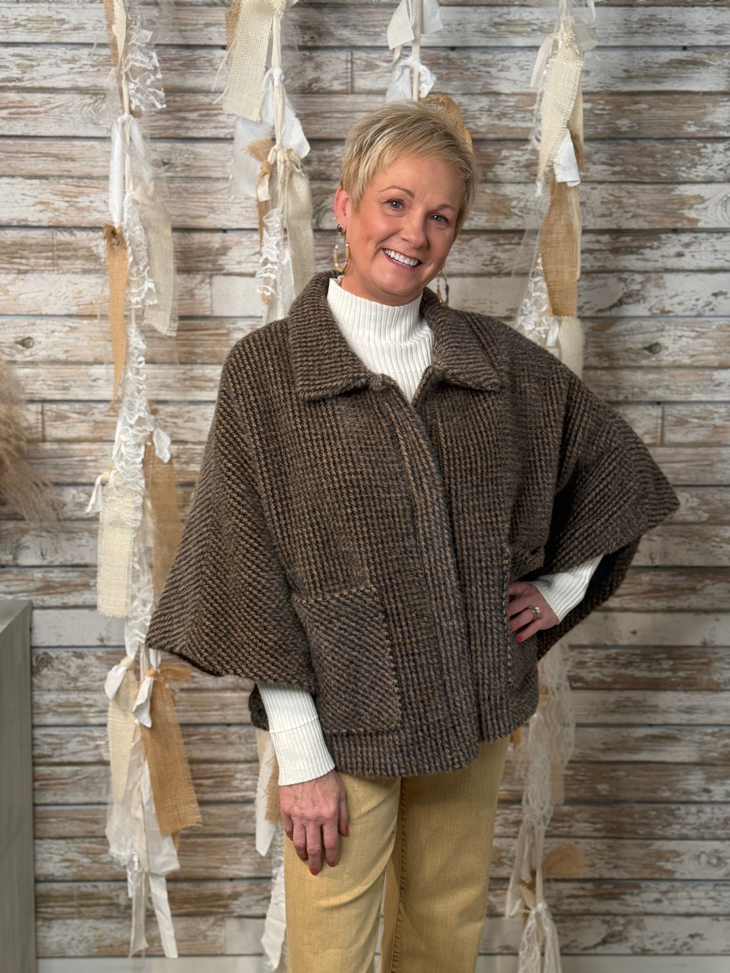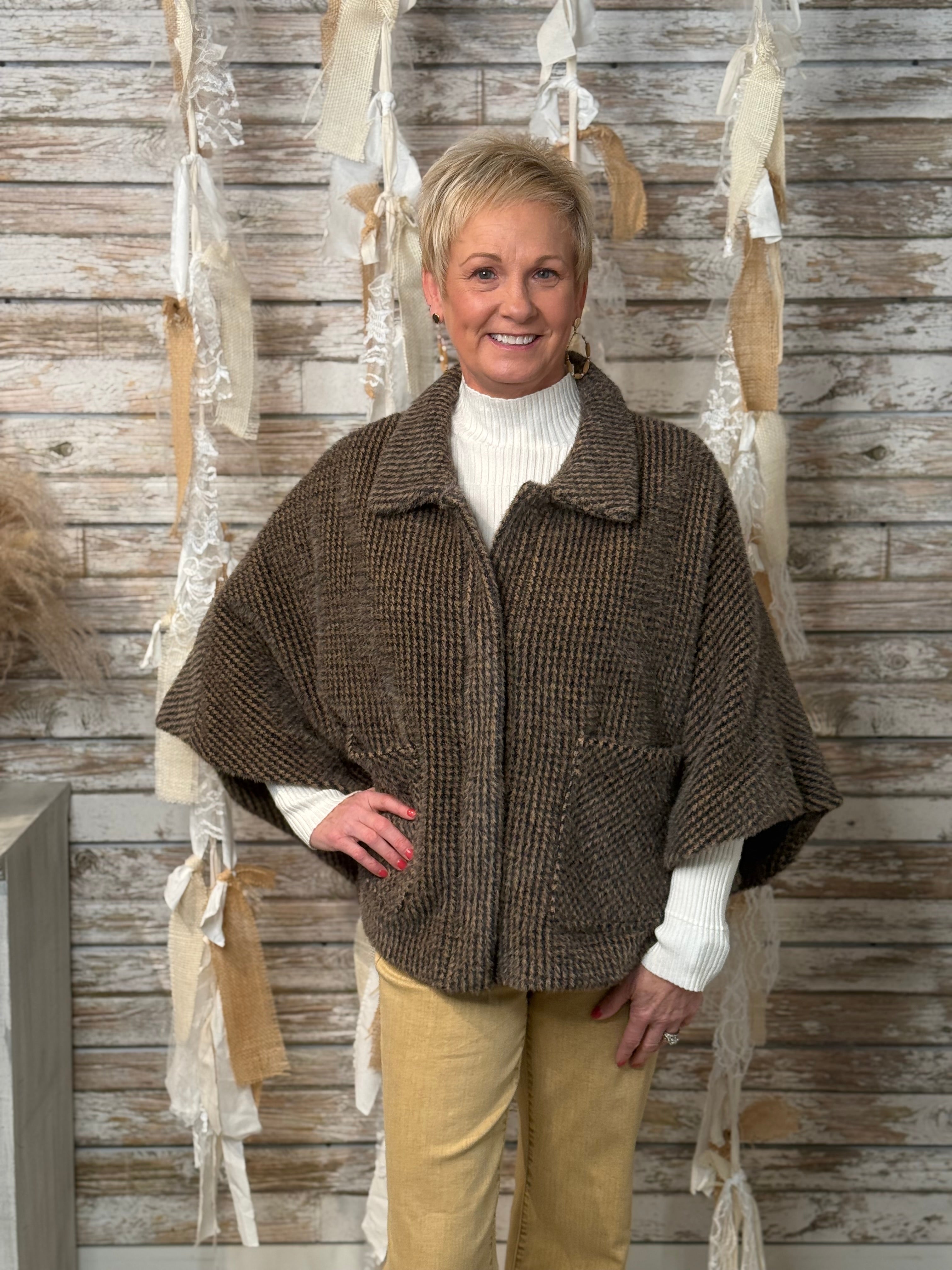 Wrap yourself in timeless charm with the Heritage Haven Cape Jacket. Designed in a cozy houndstooth weave, this chic silhouette blends vintage sophistication with modern ease. The relaxed cape sleeves and collared neckline offer an effortlessly layered look, while front patch pockets add a touch of practicality and polish. Perfect for elevating denim or topping off your favorite turtleneck — this piece is fall layering perfection with a heritage twist.