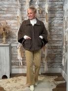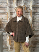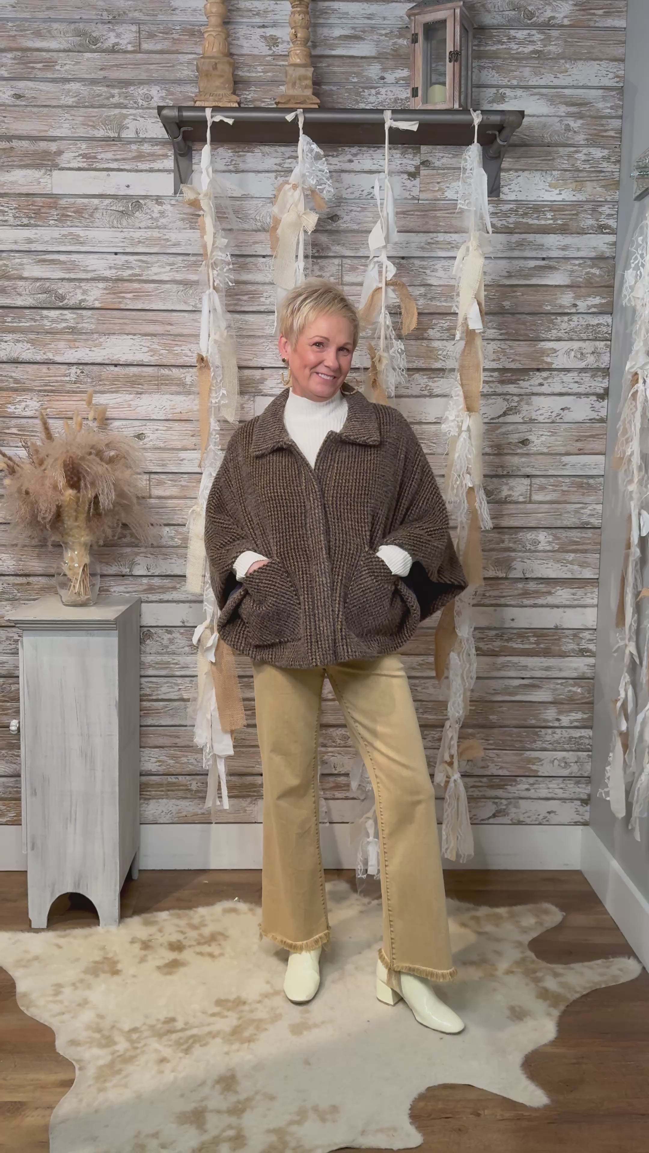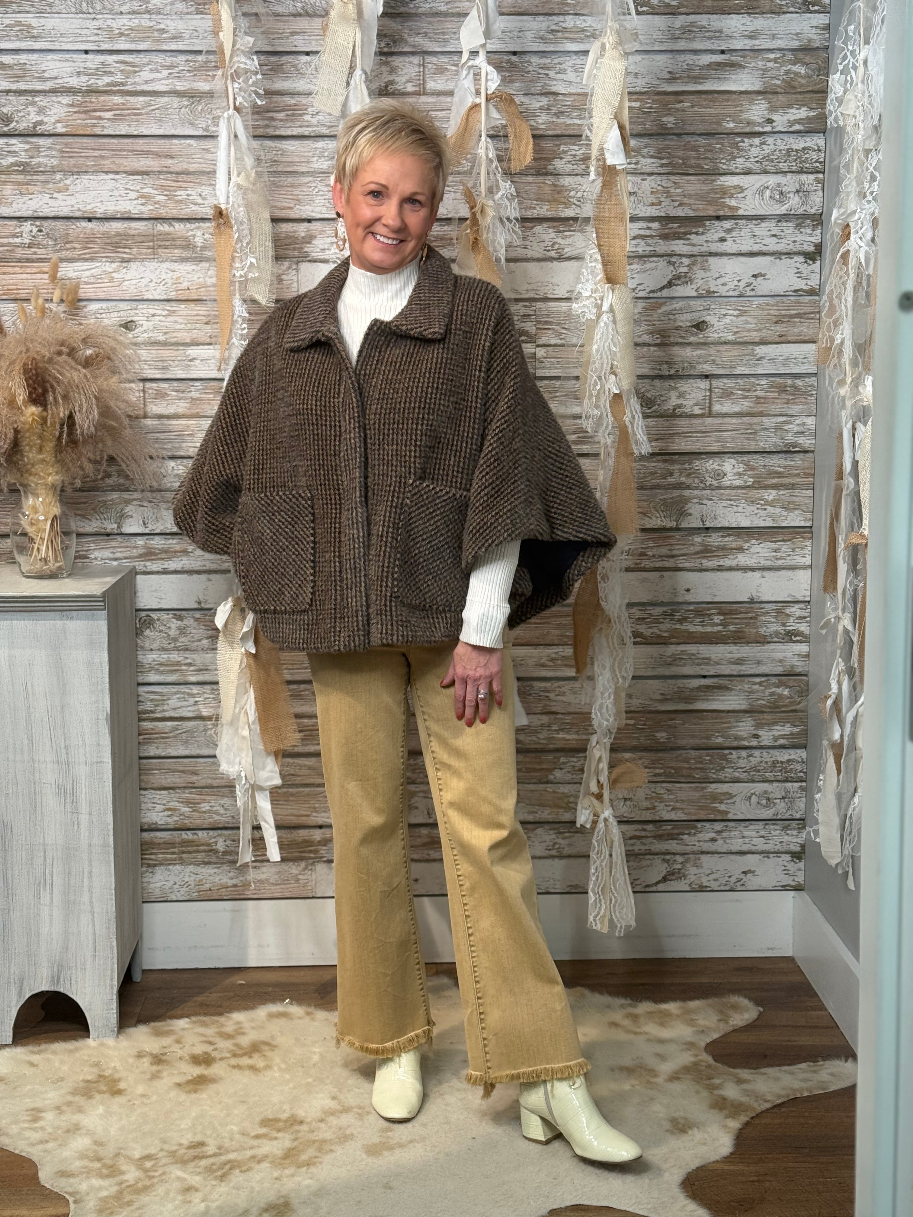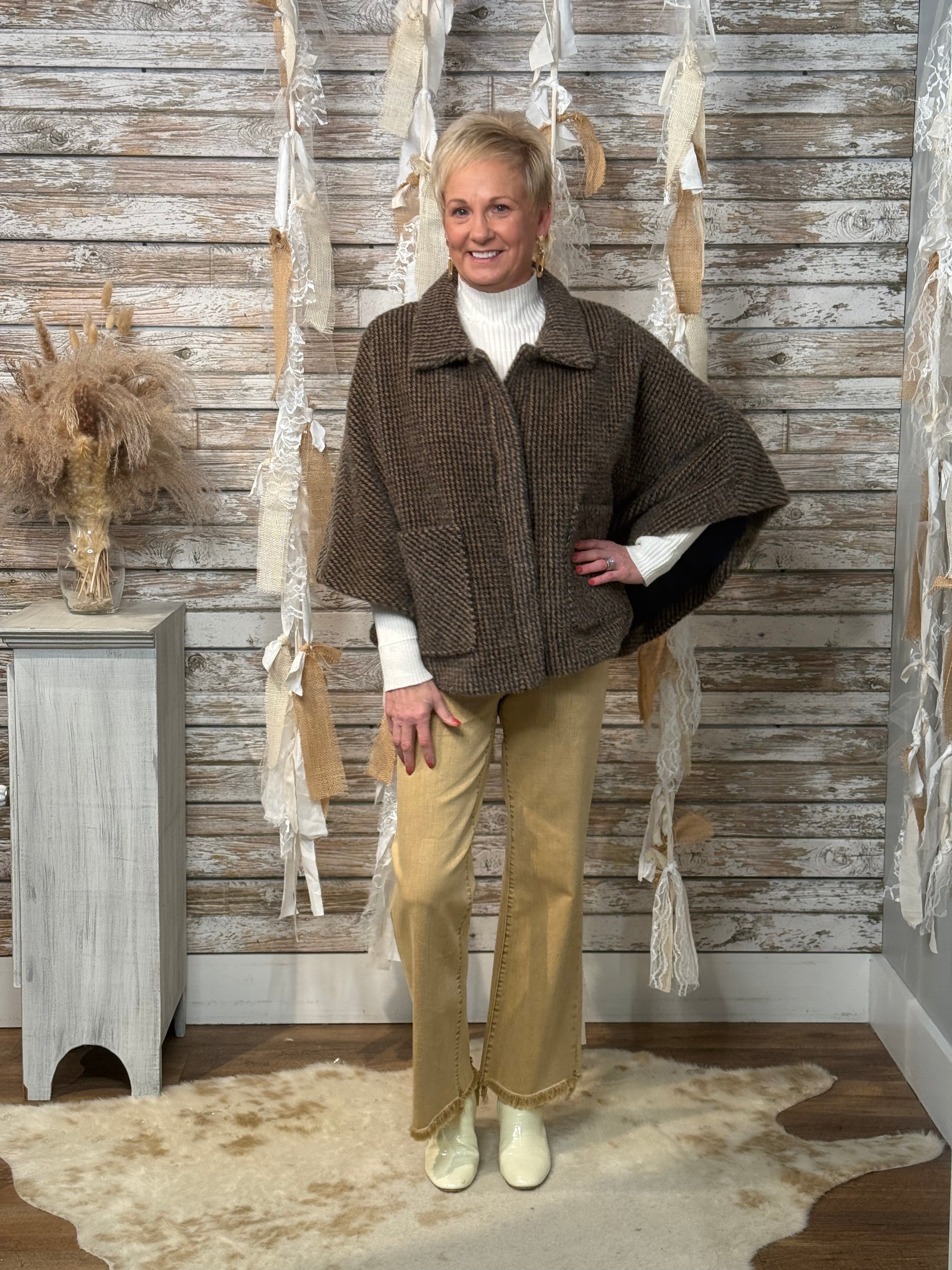 Wrap yourself in timeless charm with the Heritage Haven Cape Jacket. Designed in a cozy houndstooth weave, this chic silhouette blends vintage sophistication with modern ease. The relaxed cape sleeves and collared neckline offer an effortlessly layered look, while front patch pockets add a touch of practicality and polish. Perfect for elevating denim or topping off your favorite turtleneck — this piece is fall layering perfection with a heritage twist.