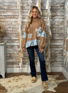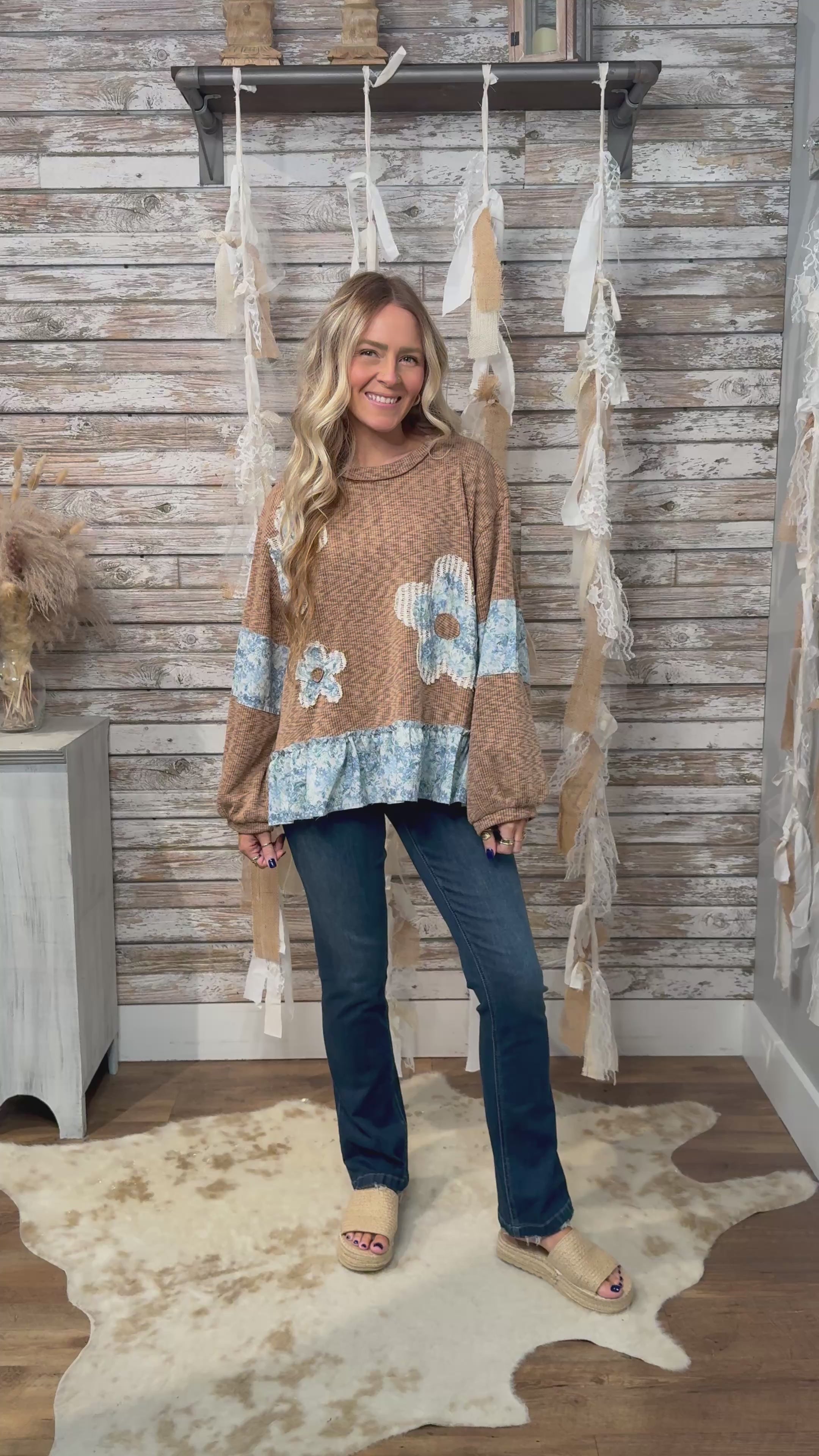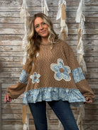 Freshly plucked from the fields of boho charm, the Meadow Bloom Patchwork Top is all about carefree comfort with a playful twist. The earthy brown knit base is adorned with oversized floral appliqués and sky-blue patchwork details, while the ruffled hemline adds a flirty, feminine finish. With its relaxed fit and whimsical vibe, this top is perfect for layering with denim, skirts, or easy lounge pants—making it a go-to for everyday wear with a touch of wanderlust.