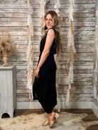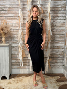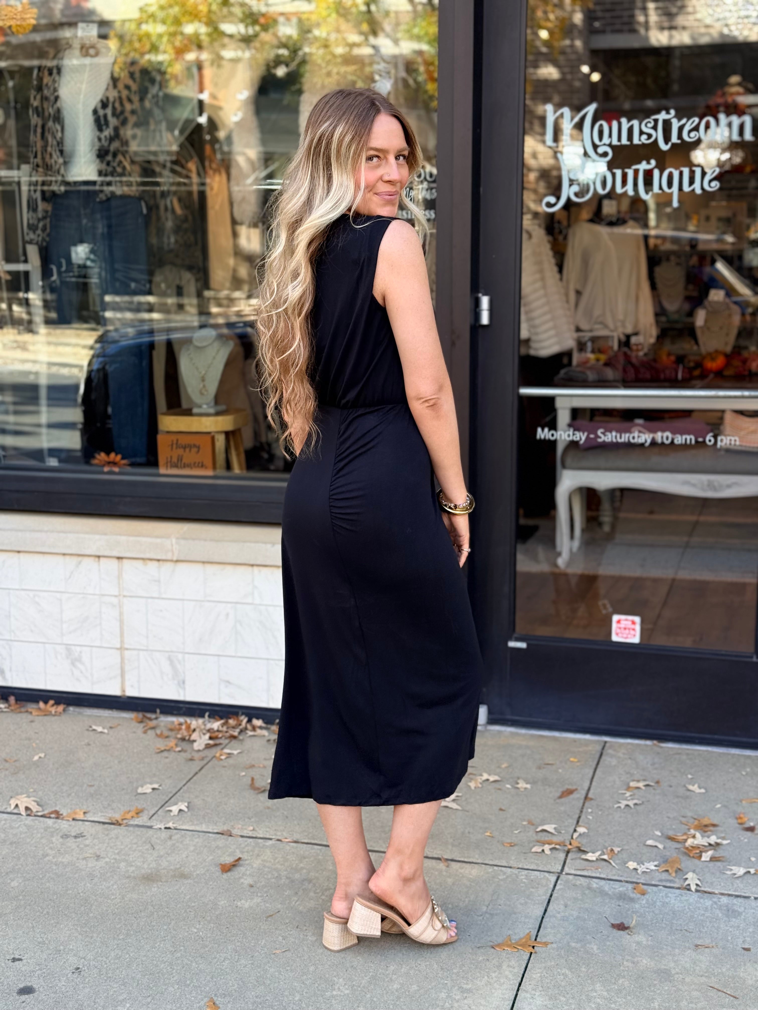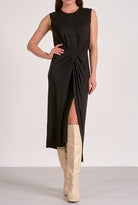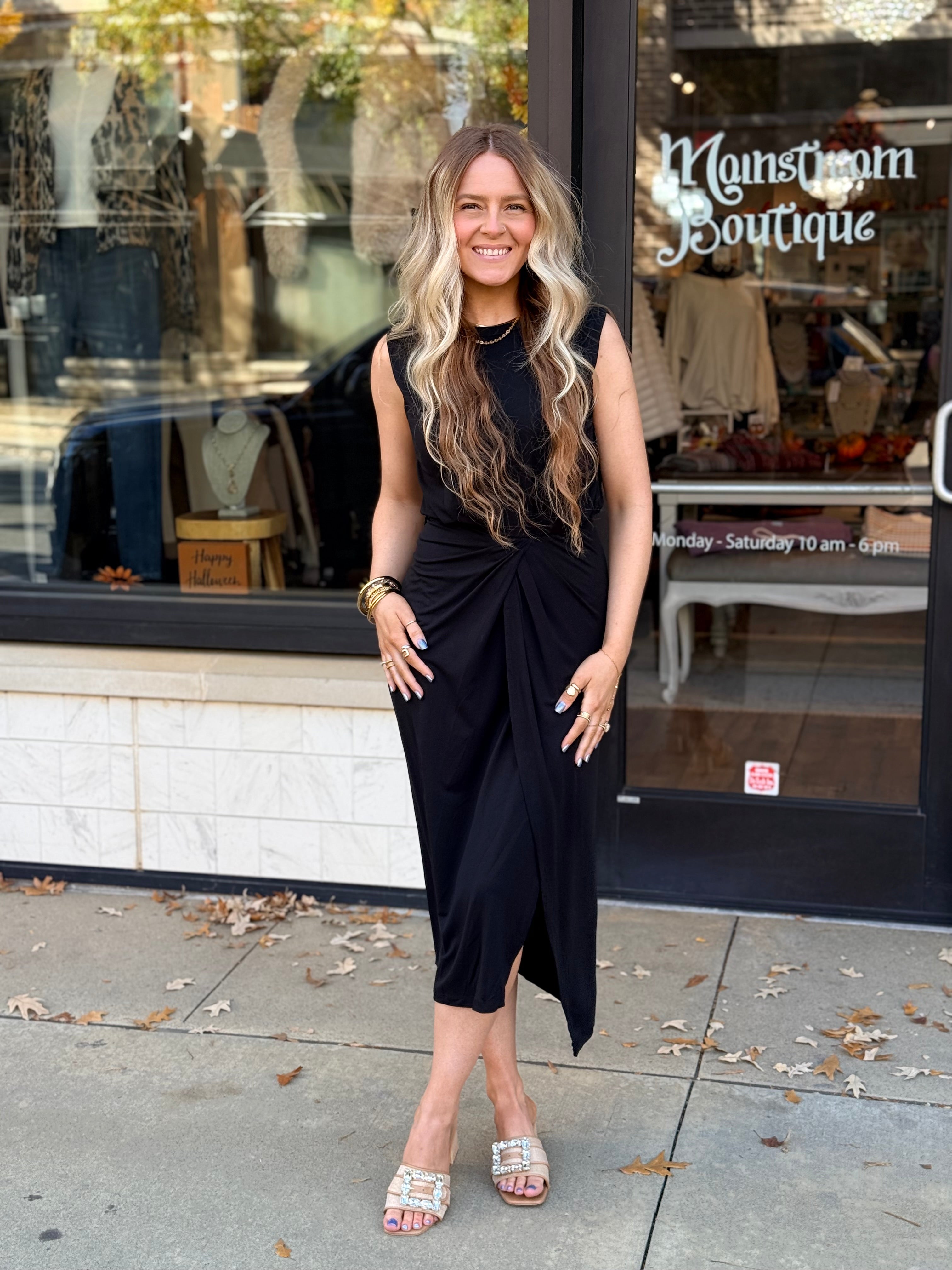 Command attention with understated elegance in the Midnight Cinch Midi. Crafted from a soft, breathable jersey blend, this sleeveless black dress features a flattering asymmetrical twist-knot at the waist that contours your silhouette effortlessly. The front slit adds a bold, leg-lengthening effect, perfectly complemented by tall boots or sleek heels. Designed for the modern muse who transitions from desk to dinner with ease, this midi dress pairs minimalist lines with a statement-making shape.