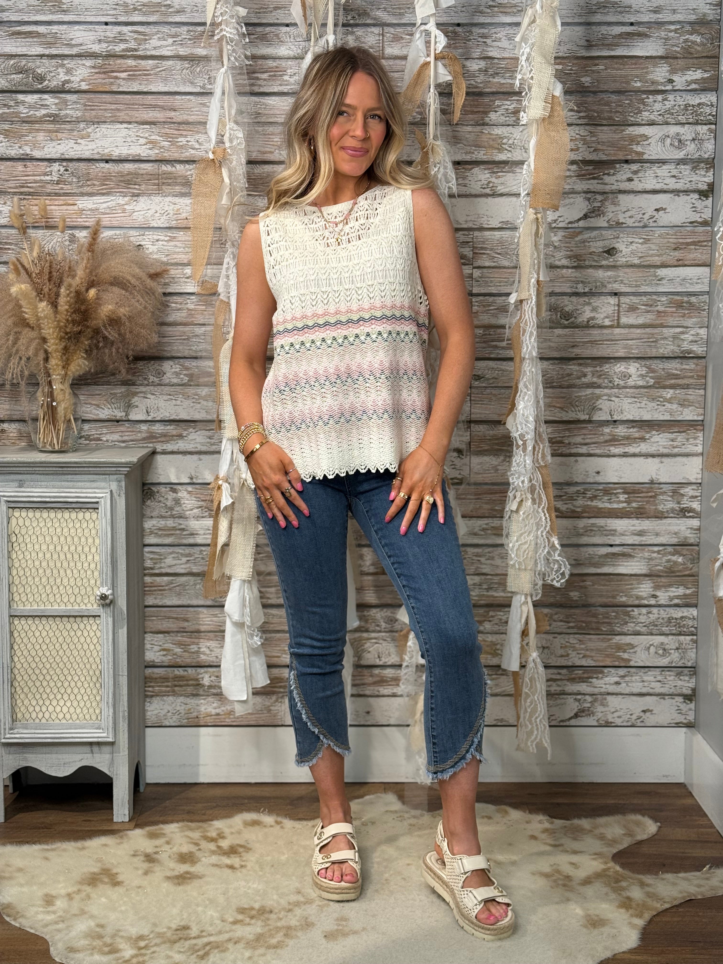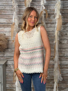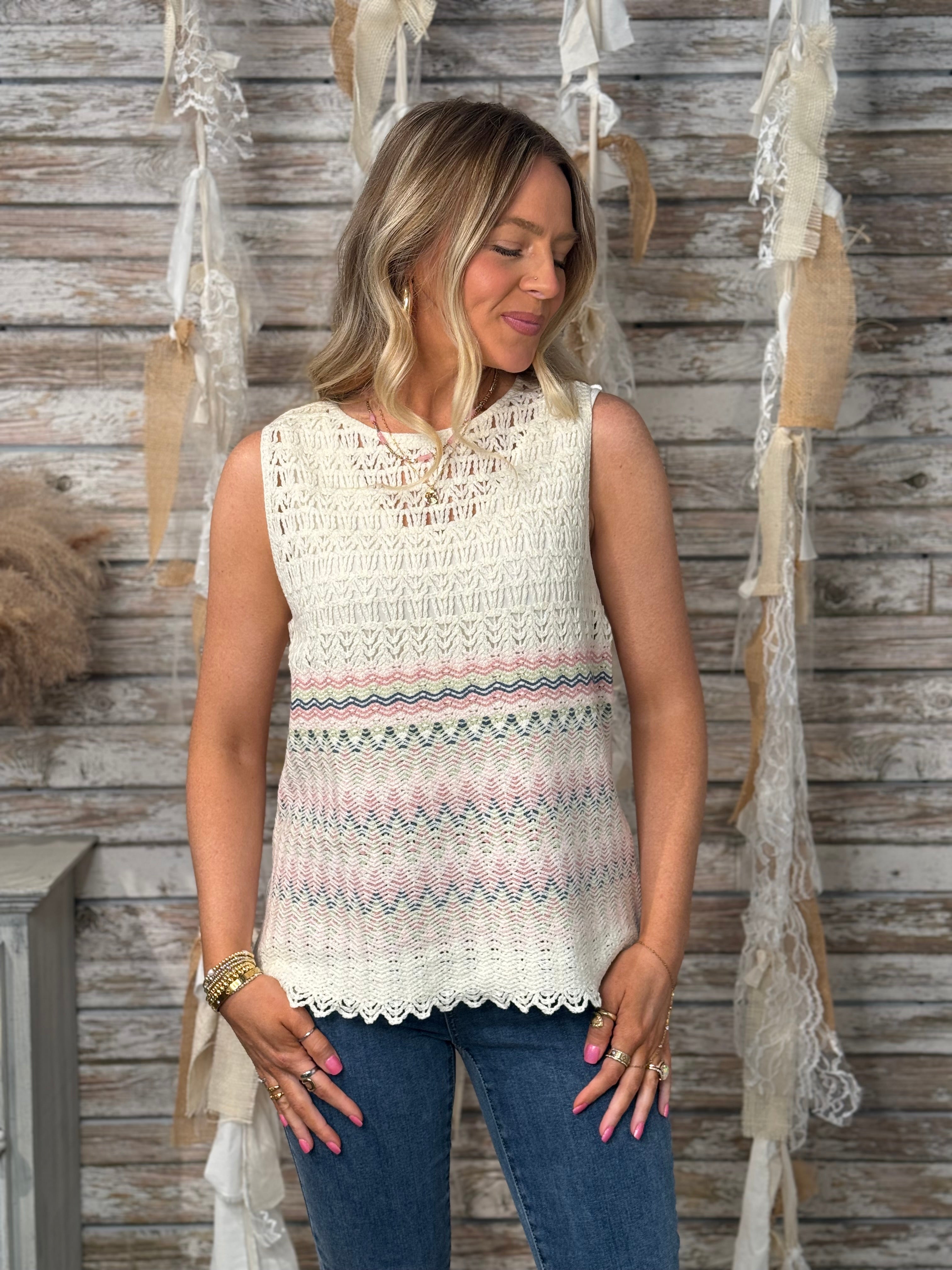 Light, airy, and effortlessly pretty, the Pastel Breeze Sleeveless Crochet Top is the perfect warm-weather staple. Featuring an intricate crochet knit with soft pastel border detailing, this sleeveless top offers a relaxed, flattering fit with a scalloped hem for a feminine touch. Layer it over a tank or bralette and pair with denim or white pants for a fresh, boutique-chic look.