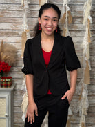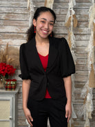 Add instant polish to any outfit with this puff-sleeve cropped blazer. Designed with a tailored silhouette and soft structure, this blazer features short balloon sleeves for a modern, feminine twist on a classic layering piece. The button-front closure and flap pockets keep the look timeless, while the cropped length makes it perfect for pairing with high-waisted trousers, skirts, or denim. Dress it up for work or style it casually for a chic everyday look—this versatile blazer does it all.