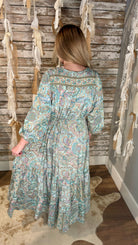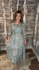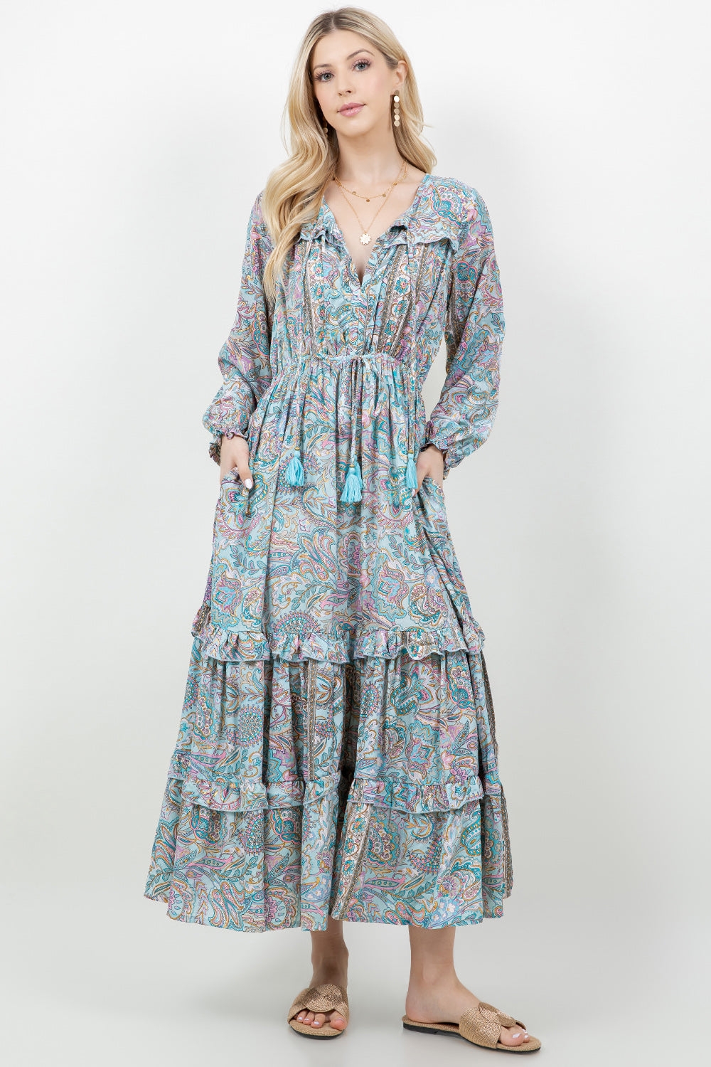 Float through the season in this beautifully detailed paisley maxi dress designed with a soft, airy silhouette and romantic movement. Featuring a flattering drawstring waist, tassel ties, and long sleeves with gentle volume, this dress offers both comfort and effortless style. The tiered skirt adds dimension and flow, while the soft mix of turquoise, lavender, and pastel tones creates a fresh, feminine look. Perfect for brunch, vacation days, or casual events, this boho-inspired maxi pairs easily with sandals or wedges for an elevated everyday outfit.
