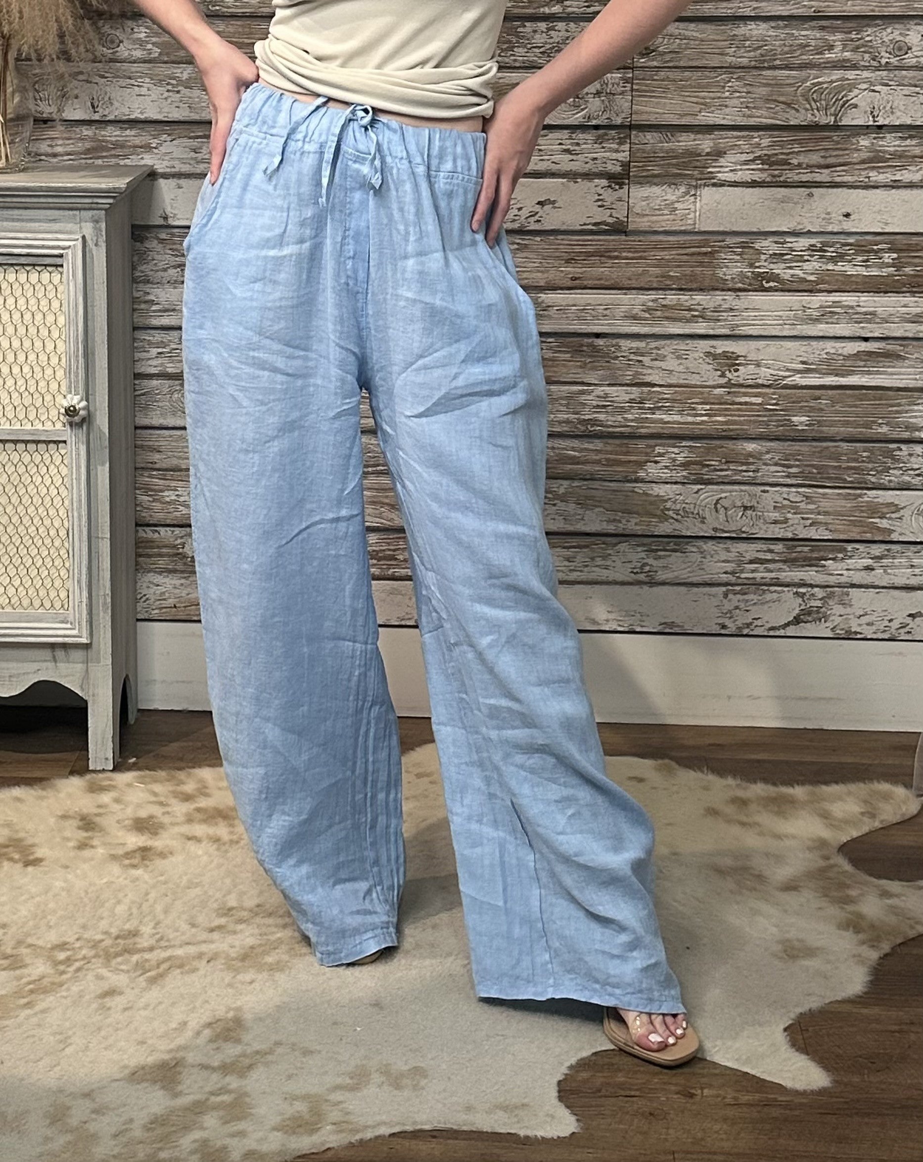Sky Blue Relaxed Linen Wide-Leg Drawstring Pants