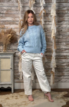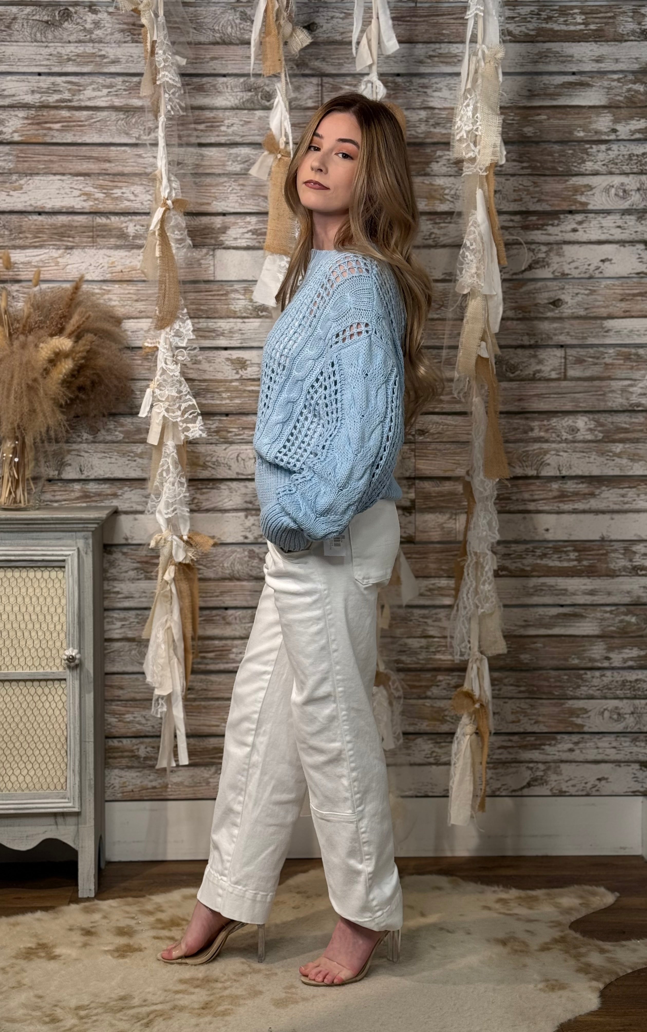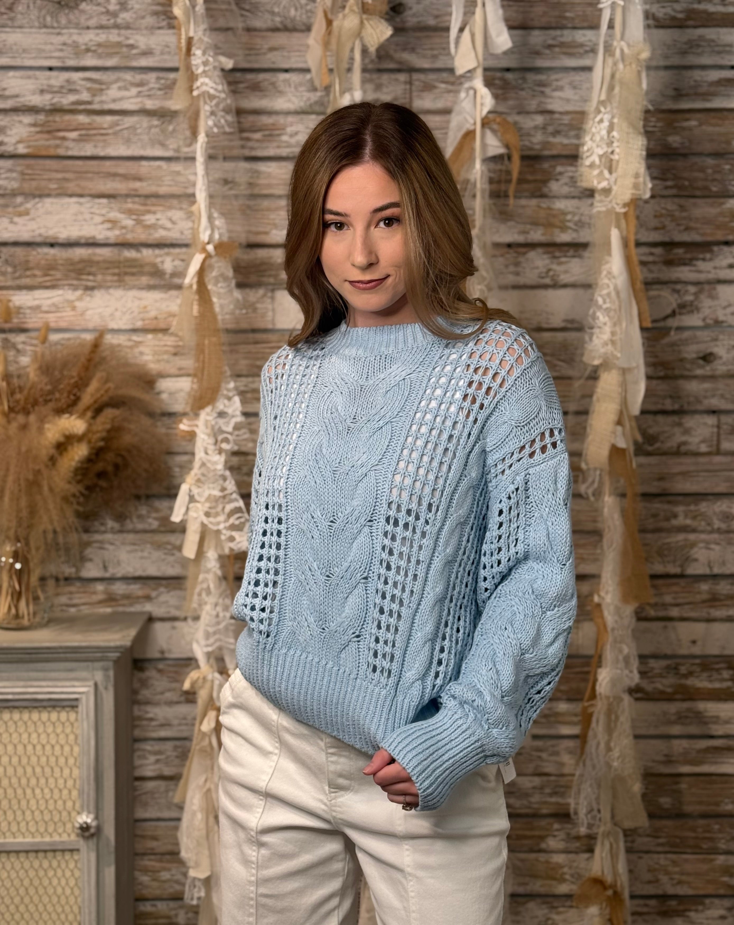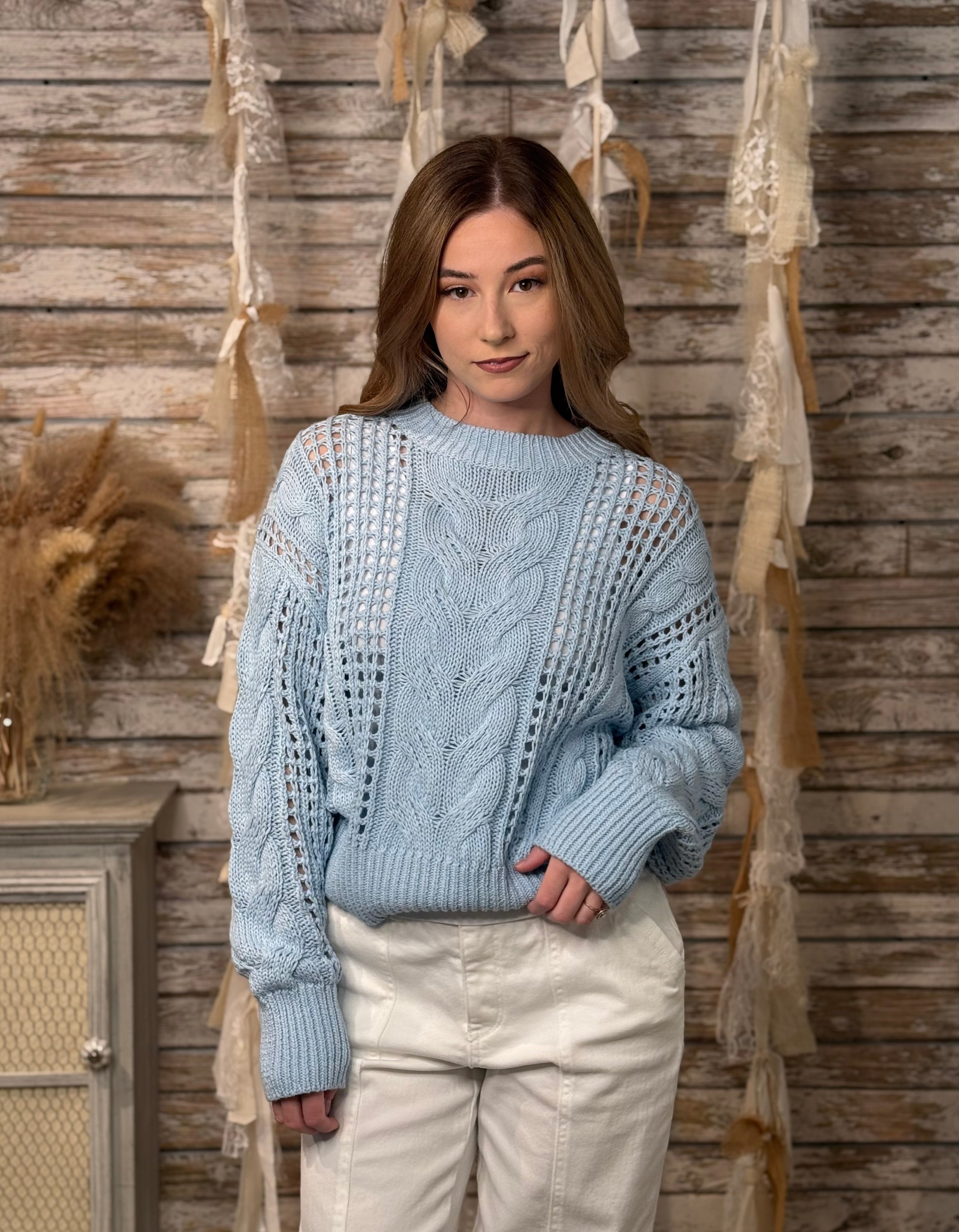 Light, airy, and effortlessly stylish, the Sky Breeze Open Knit Sweater is the perfect transitional layer for spring and cool summer evenings. Designed in a soft sky-blue hue, this sweater features an intricate mix of cable knit and open weave crochet patterns that create beautiful texture and dimension. The relaxed silhouette, ribbed crew neckline, and wide ribbed hem provide a comfortable yet polished fit, making it easy to pair with denim, trousers, or flowy skirts.