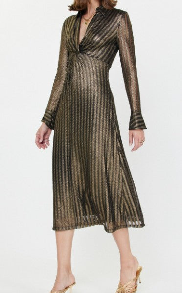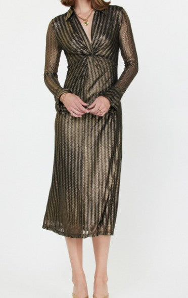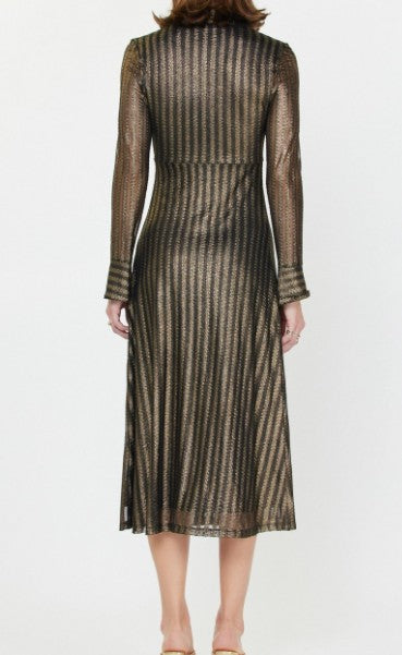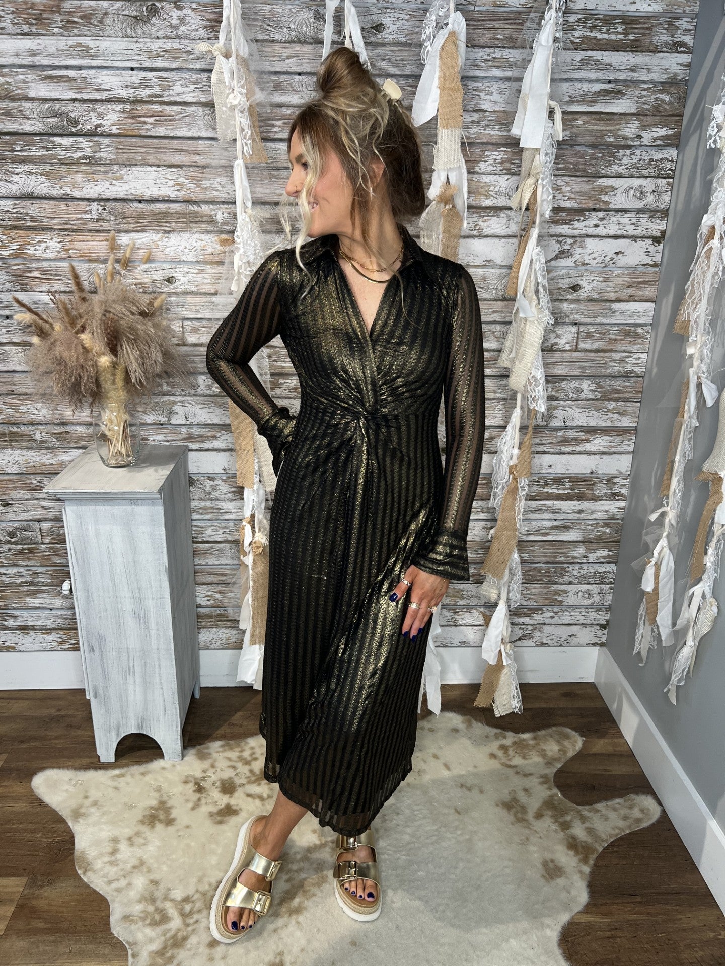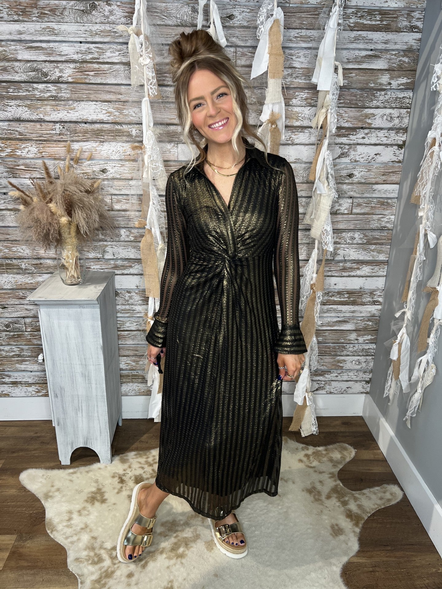 Shimmer into the spotlight with the Starlight Serenade Dress! Designed in a striking metallic stripe, this dress features a pointed collar and plunging v-neckline that frames the face beautifully. The front twist knot adds just the right amount of drama, while sheer long sleeves with buttoned cuffs bring an elegant touch. Finished with a softly flared midi skirt, it’s the perfect mix of sophistication and allure—made for evenings that call for a little sparkle.