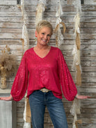 Meet your new go-to glam top for every celebration. The Starlight Soirée Sequin Top brings effortless sparkle with its shimmering sequin finish and flattering V-neckline. The balloon sleeves add a touch of drama while keeping the fit relaxed and comfortable. Fully lined for smooth, easy wear (no scratchy sequins here!), this top shines for holiday parties, nights out, concerts, and every moment you want to feel a little extra.