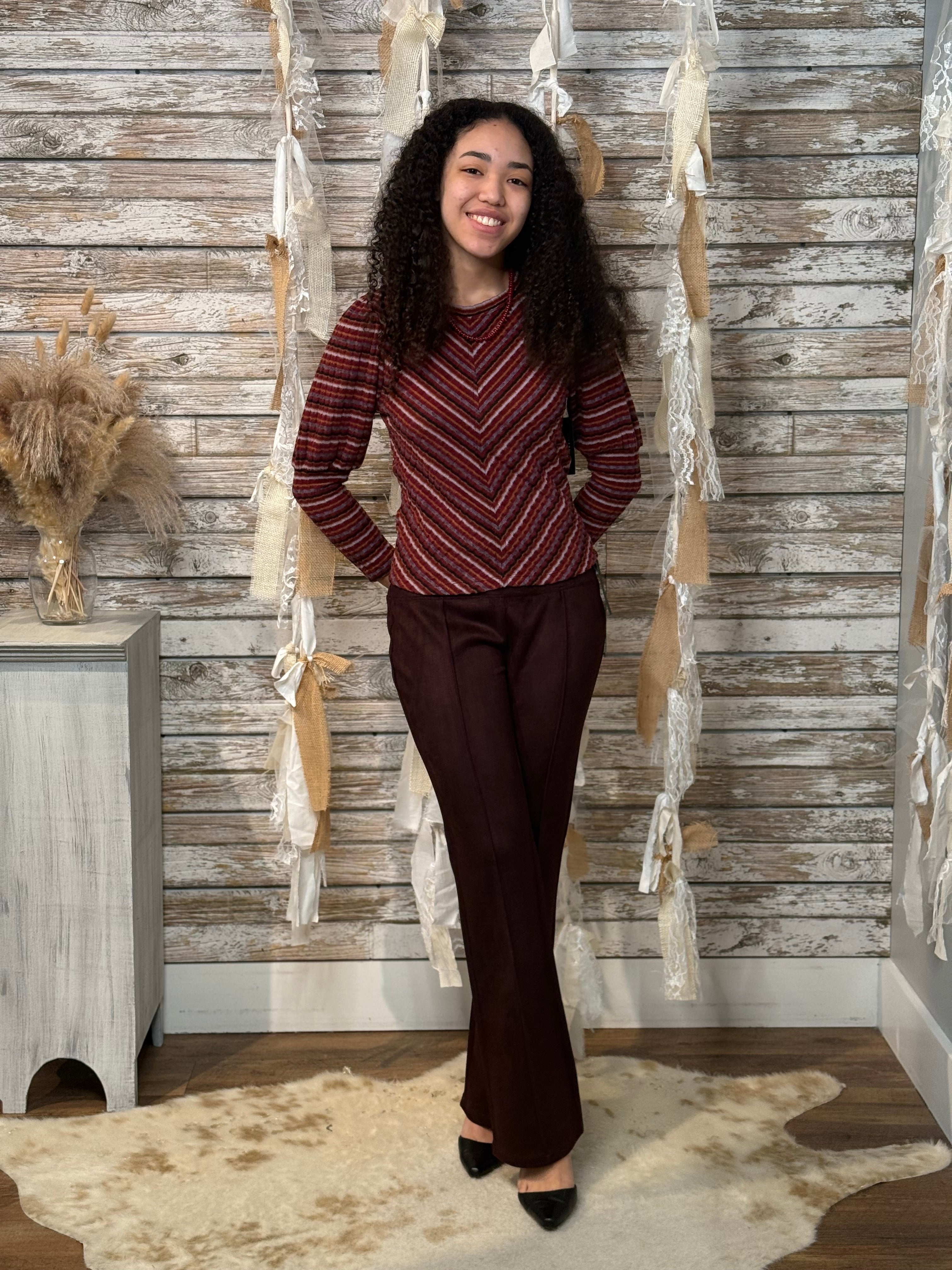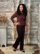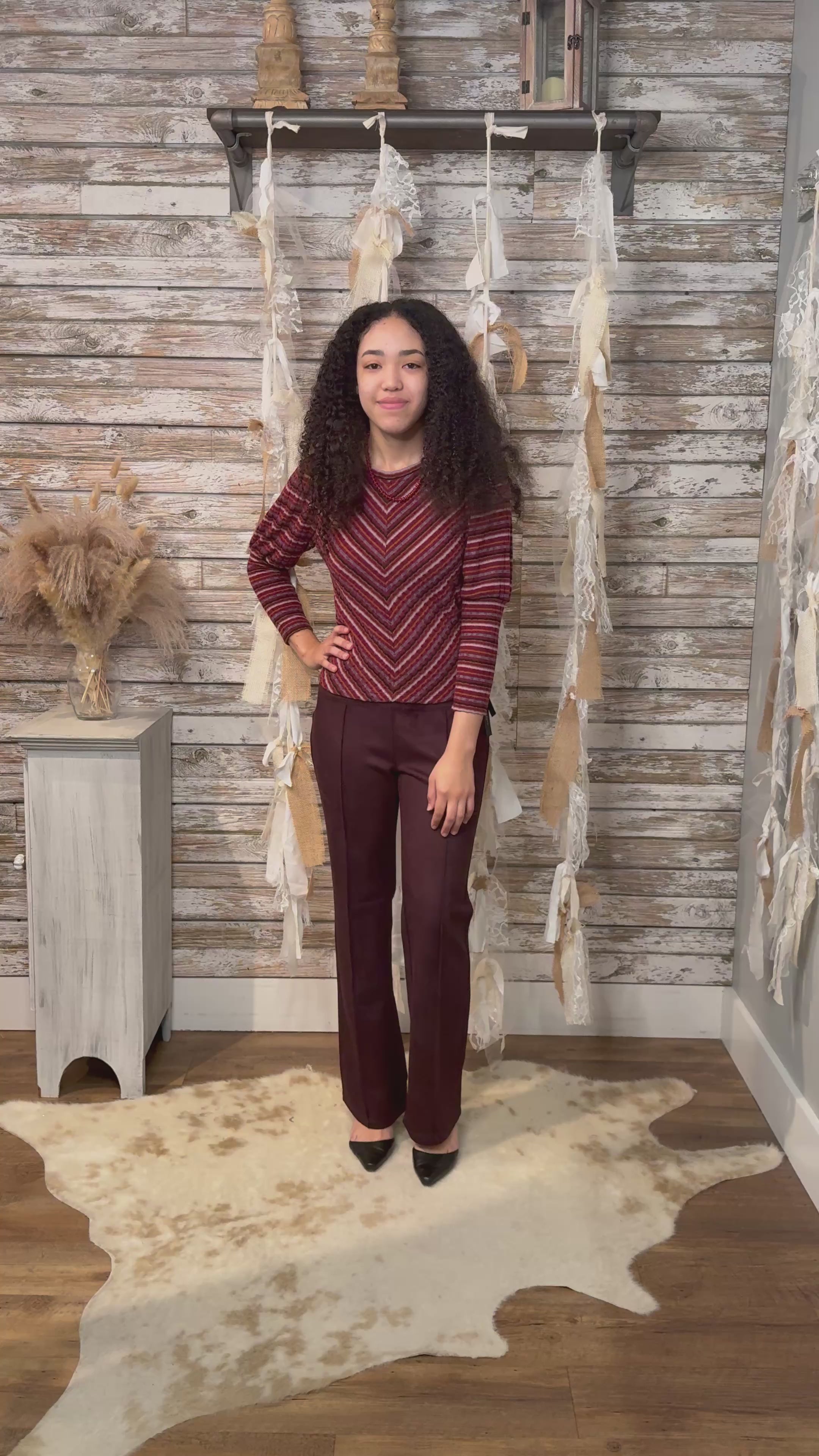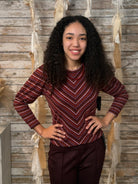 Add a touch of retro romance with The Juliette Chevron Top. Featuring a rich mix of autumn stripes in a flattering chevron pattern, this soft knit brings instant warmth and charm. The 3/4 puff sleeves add feminine flair, while the fitted silhouette makes it perfect for tucking into your favorite flares or cords. Effortlessly chic, endlessly wearable — Juliette is the statement knit you’ll reach for all season long.